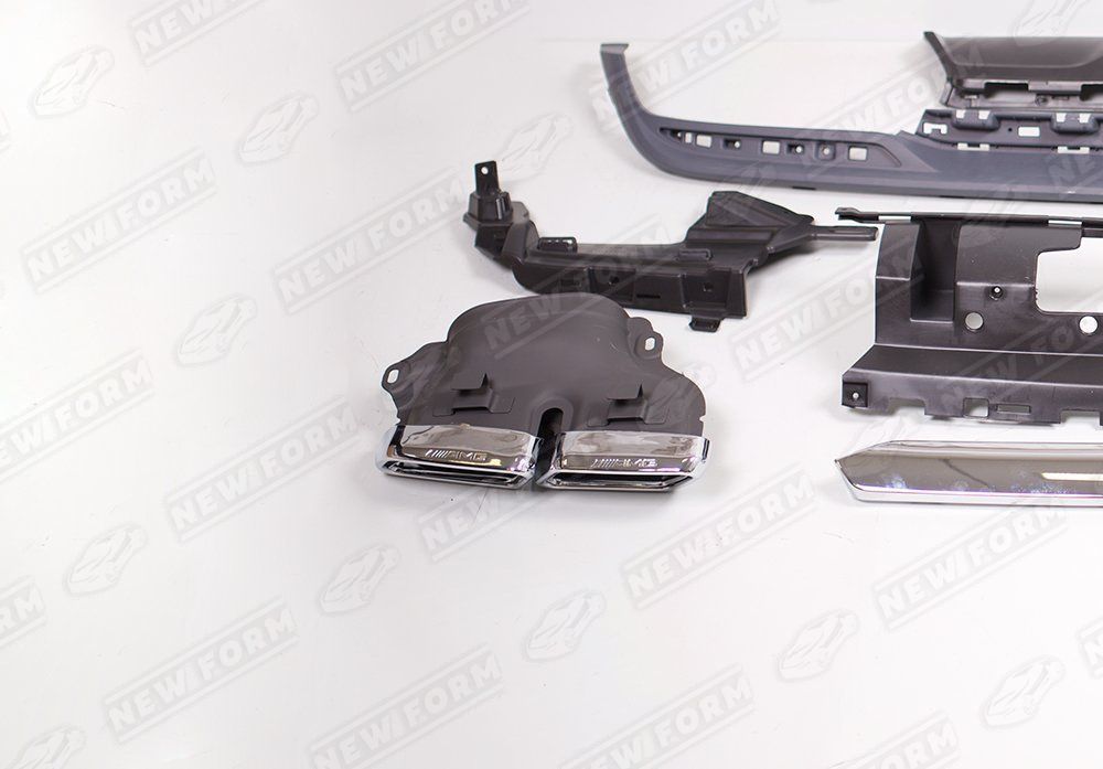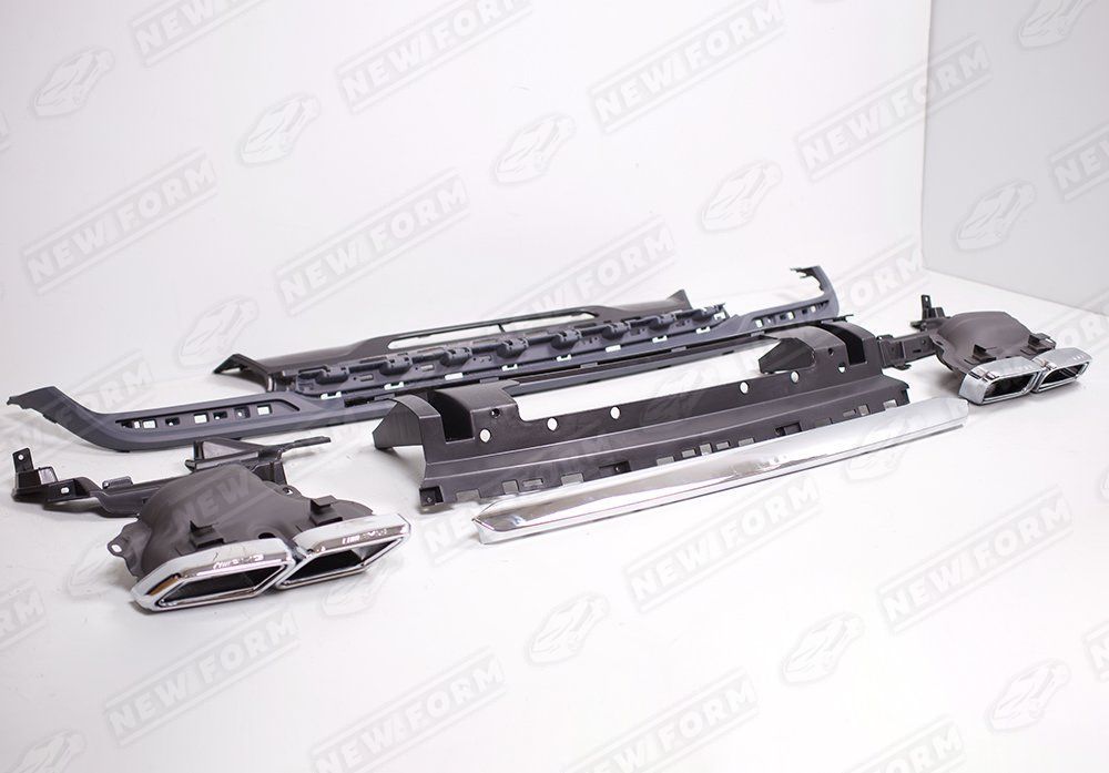 В комплект входит: диффузор заднего бампера AMG, крепеж диффузора, хромированная вставка в диффузор, кронштейны насадок, насадки на глушитель 6.3 AMG, комплект крепежа.