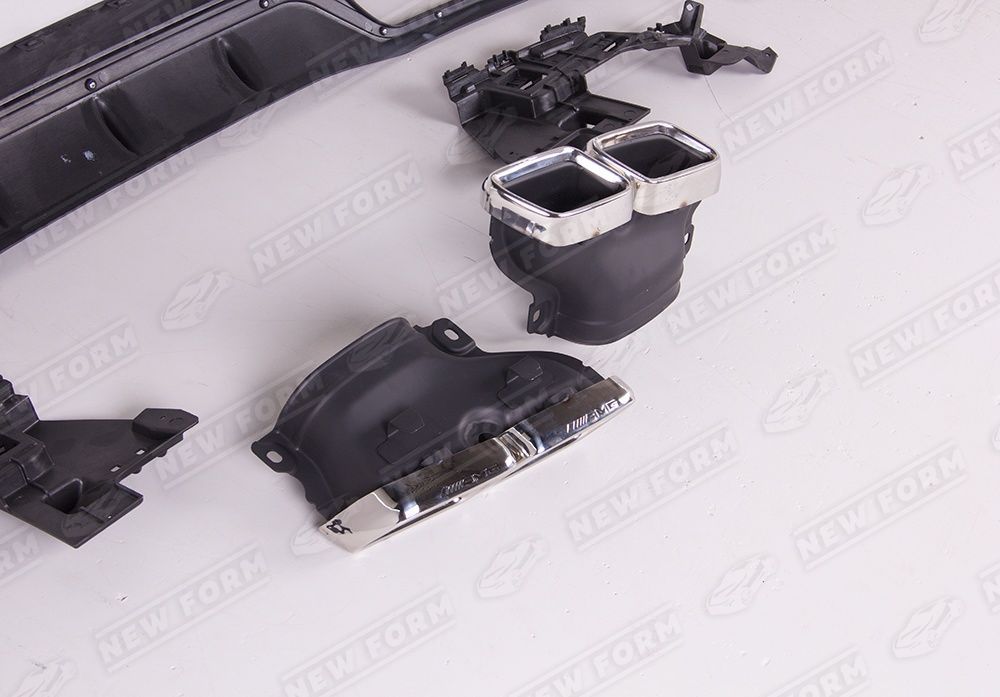 В комплект входит: диффузор заднего бампера 6.3 AMG, центральный усилитель, кронштейны насадок, заглушка буксировочной петли, молдинг в диффузор, насадки на глушитель 6.3 AMG, комплект крепежа.