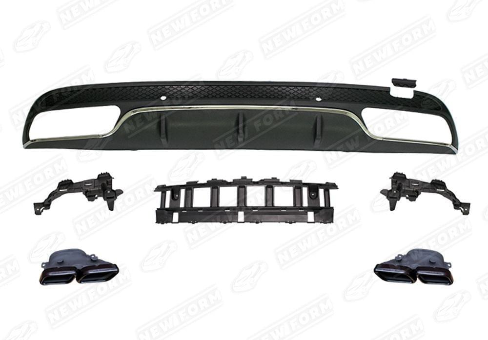 В комплект входит: диффузор заднего бампера 6.3 AMG, центральный усилитель, кронштейны насадок, заглушка буксировочной петли, молдинг в диффузор, насадки на глушитель 6.3 AMG, комплект крепежа.