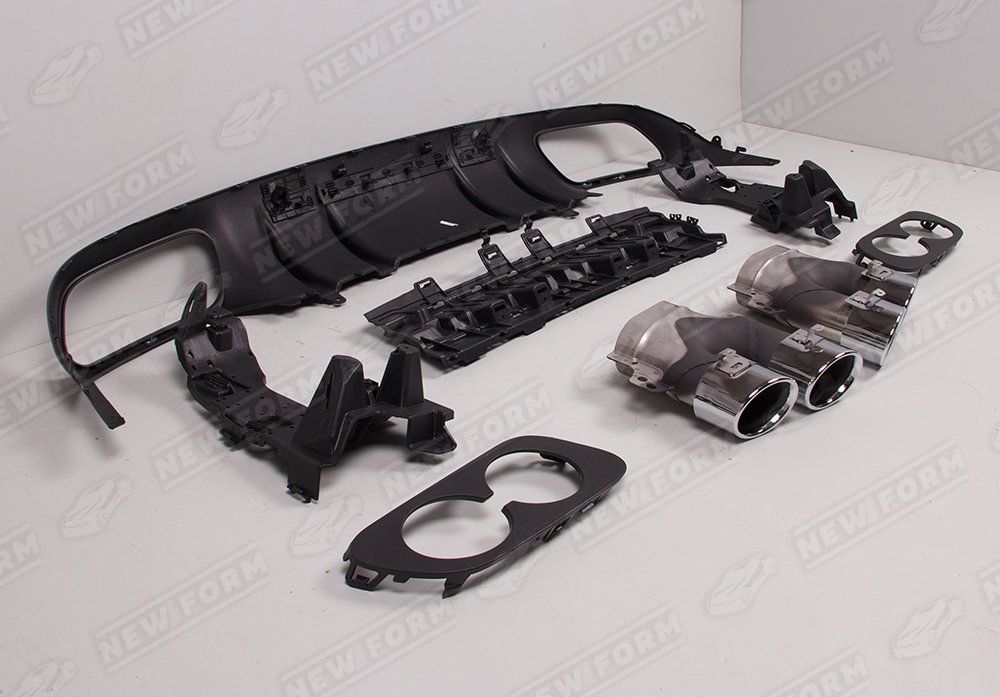 В комплект входит: диффузор заднего бампера 4.3 AMG, центральный усилитель, кронштейны насадок, насадки на глушитель 4.3 AMG, комплект крепежа.