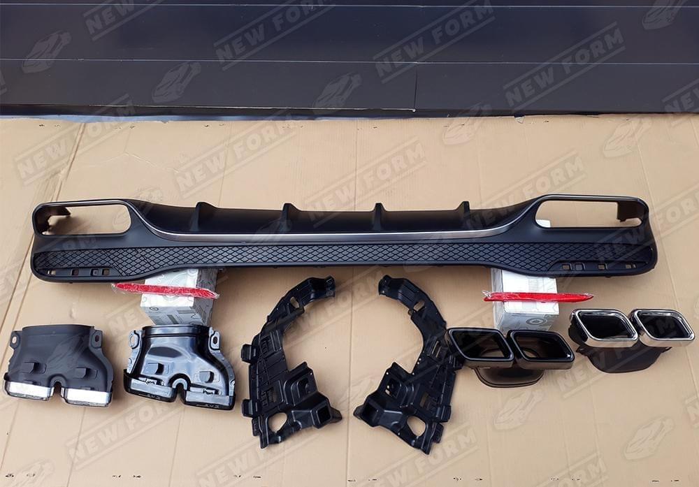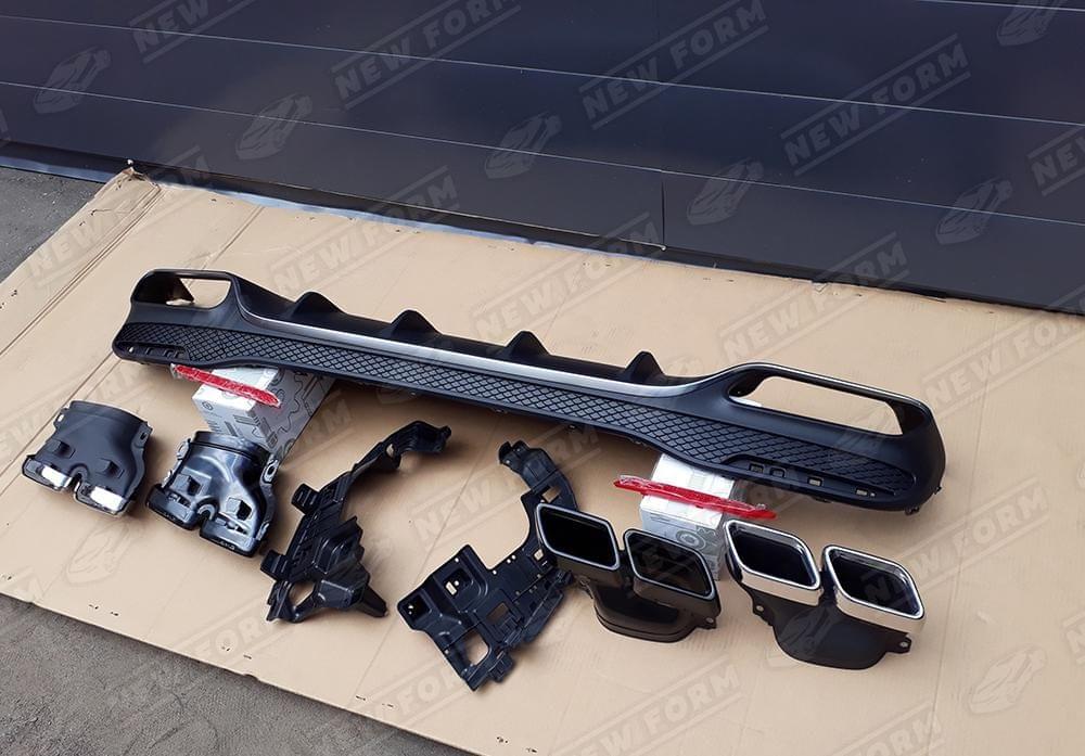 В комплект входит: диффузор заднего бампера 6.3 AMG, заглушка буксировочной петли, катафоты, молдинг диффузора, кронштейны насадок, насадки на глушитель 6.3 AMG, комплект крепежа.