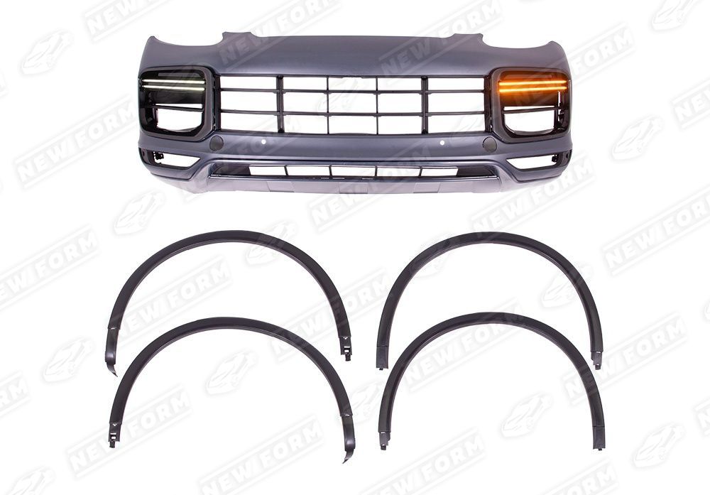 Бампер передний рестайлинг 2022 для автомобилей Porsche Cayenne 958. Данный передний бампер предназначен для установки на автомобили Porsche Cayenne 958 с 2010 по 2014 год выпуска. Бампер рестайлинг 2022 и расширители колесных арок выполнены из оригинального ABS пластика. Ходовые огни с функцией поворотника. Бампер устанавливается четко в штатные места автомобиля без доработок. Весь необходимый для корректной установки переднего бампера рестайлинг 2022 крепеж входит в комплект.