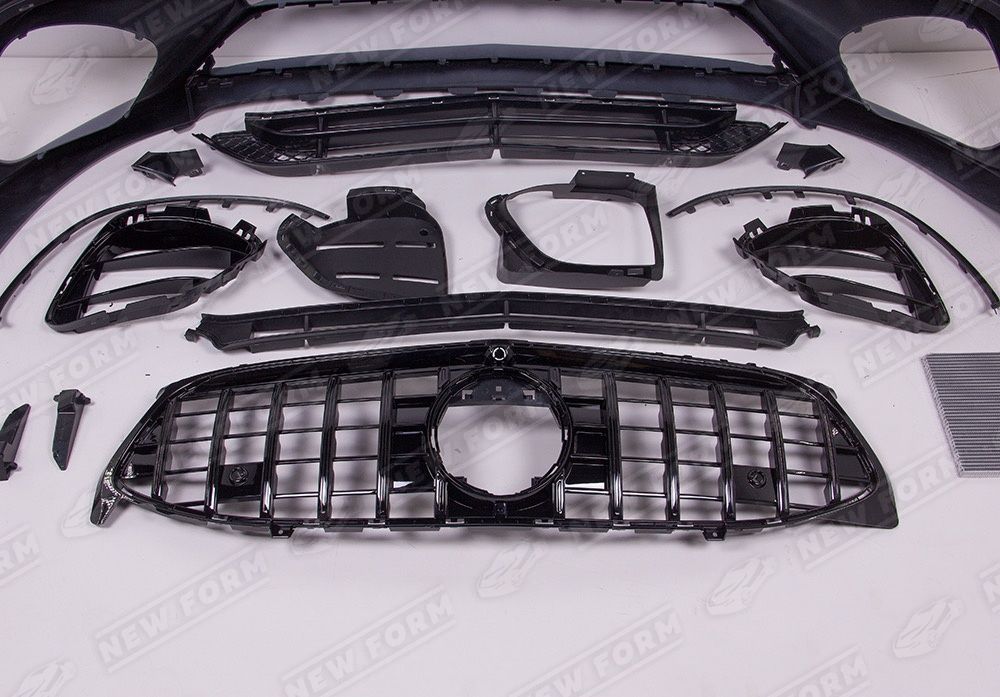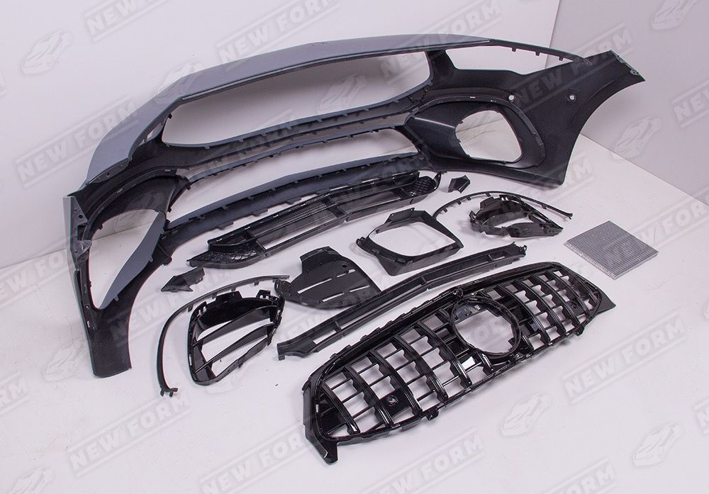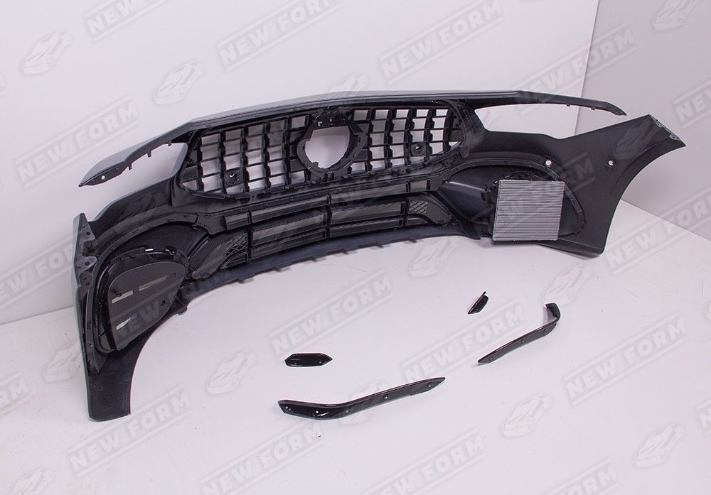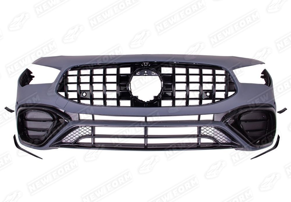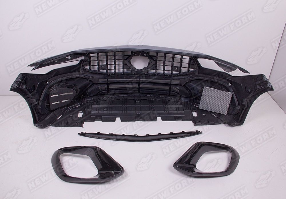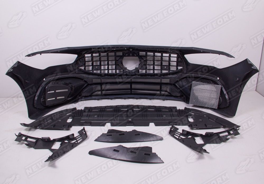 Передний бампер 4.5 AMG черный для автомобилей Mercedes CLA C118/X118. Данный передний бампер предназначен для установки на автомобили Mercedes CLA C118/X118 с 2019 года выпуска обычной версии и в AMG пакете. Передний бампер выполнен из оригинального ABS пластика. Бампер 4.5 AMG устанавливается четко в штатные места автомобиля без доработок. Передний бампер поставляется под окрас. Решетка радиатора выполнена в черном цвете.