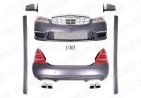 Комплект рестайлинга 6.3 AMG полный для автомобилей Mercedes S-class W221. Данный комплект рестайлинга предназначен для установки на автомобили Mercedes S-class W221 с 2005 по 2009 год выпуска. Комплект позволяет переделать внешний облик автомобиля в версию 6.3 AMG рестайлинг. Комплектующие рестайлинга изготовлены из ABS пластика, насадки на глушитель - нержавеющая сталь. Рестайлинг устанавливается в штатные места без доработок. Комплект поставляется под окрас. Диффузор заднего бампера черный. На насадки нанесена гравировка AMG.
