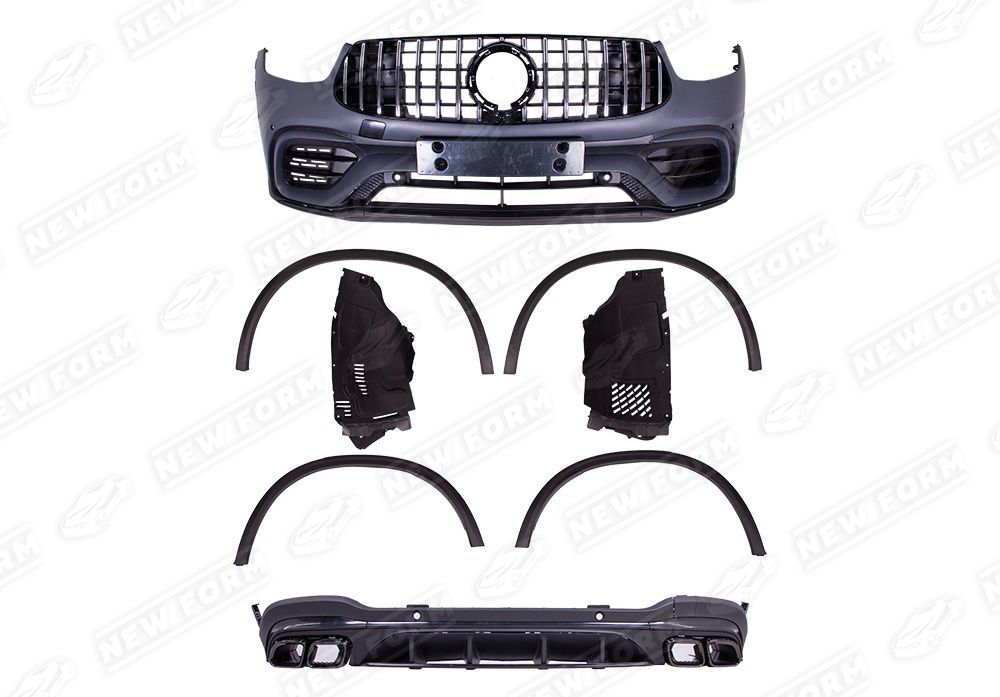 В комплект обвеса входит: передний бампер в сборе, решетка радиатора AMG GT, диффузор заднего бампера, молдинг диффузора, насадки на глушитель, расширители колесных арок передние, подкрылки передние, комплект крепежа.