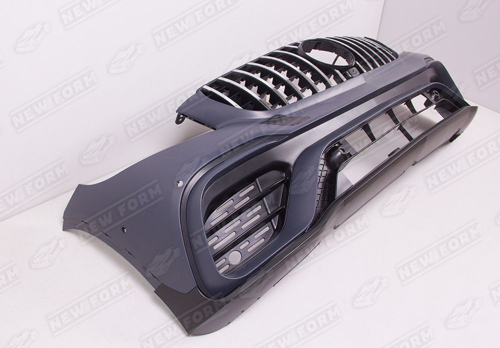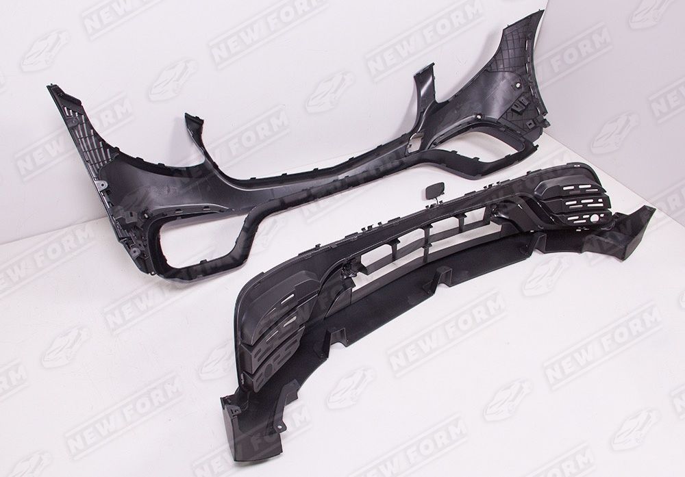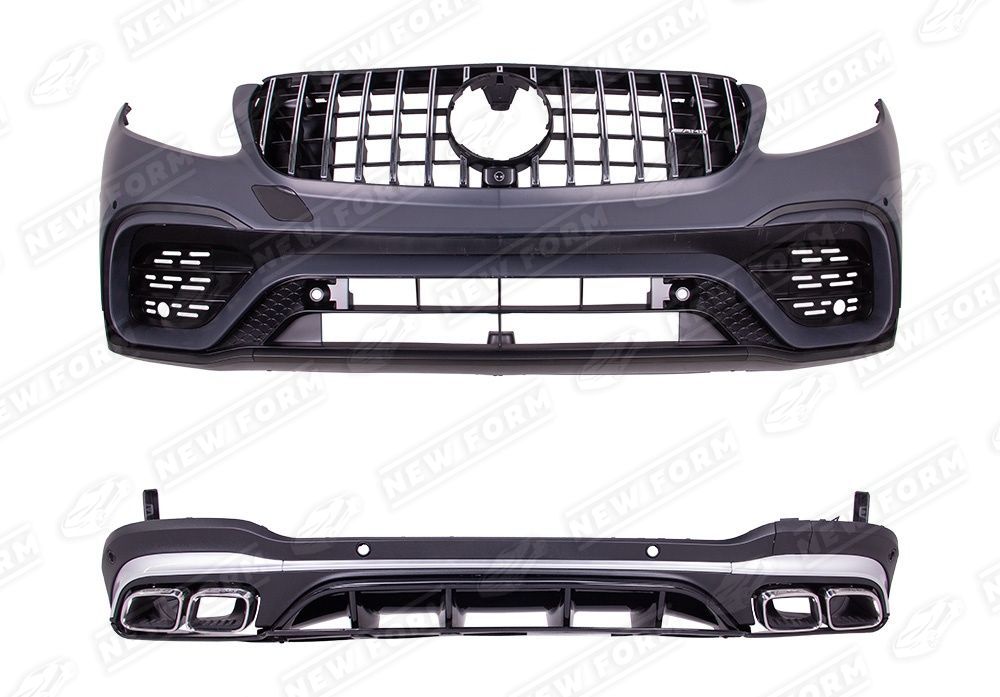 Обвес 6.3 AMG для автомобилей Mercedes GLC. Данный тюнинг комплект предназначен для установки на бензиновую версию автомобиля Mercedes GLC X253 с 2015 по 2019 год выпуска в AMG пакете. Комплектующие обвеса изготовлены из оригинального ABS пластика. Насадки на глушитель - нержавеющая сталь. Обвес устанавливается четко в штатные места без доработок. Передний бампер поставляется под окрас. Диффузор заднего бампера выполнен в черном цвете. Насадки на глушитель и решетка радиатора на выбор черные или хром. На насадки нанесен логотип AMG.