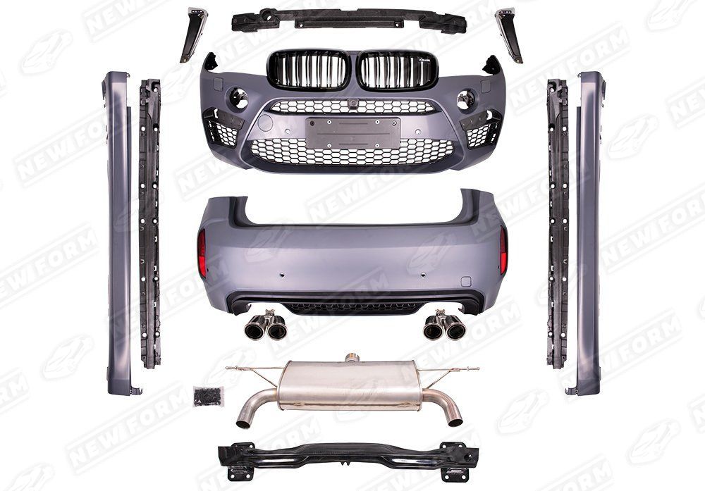 Обвес M для автомобилей BMW X6 F16. Данный тюнинг комплект предназначен для установки на автомобили BMW X6 F16 с 2014 по 2019 год выпуска. Обвес позволяет изменить внешний облик автомобиля стандартной версии на версию X6 M. Комплектующие обвеса выполнены из оригинального ABS пластика. Выхлопная система и насадки на глушитель - нержавеющая сталь. Обвес X6 M устанавливается четко в штатные места автомобиля без доработок. Обвес поставляется под окрас.
