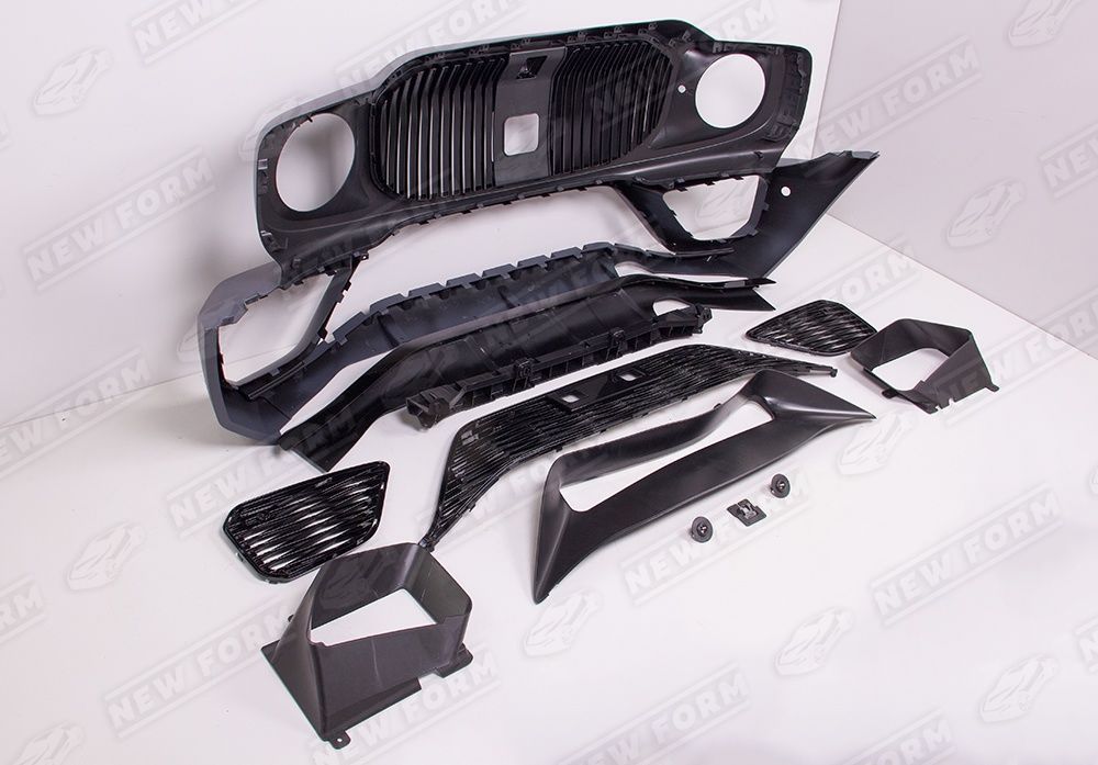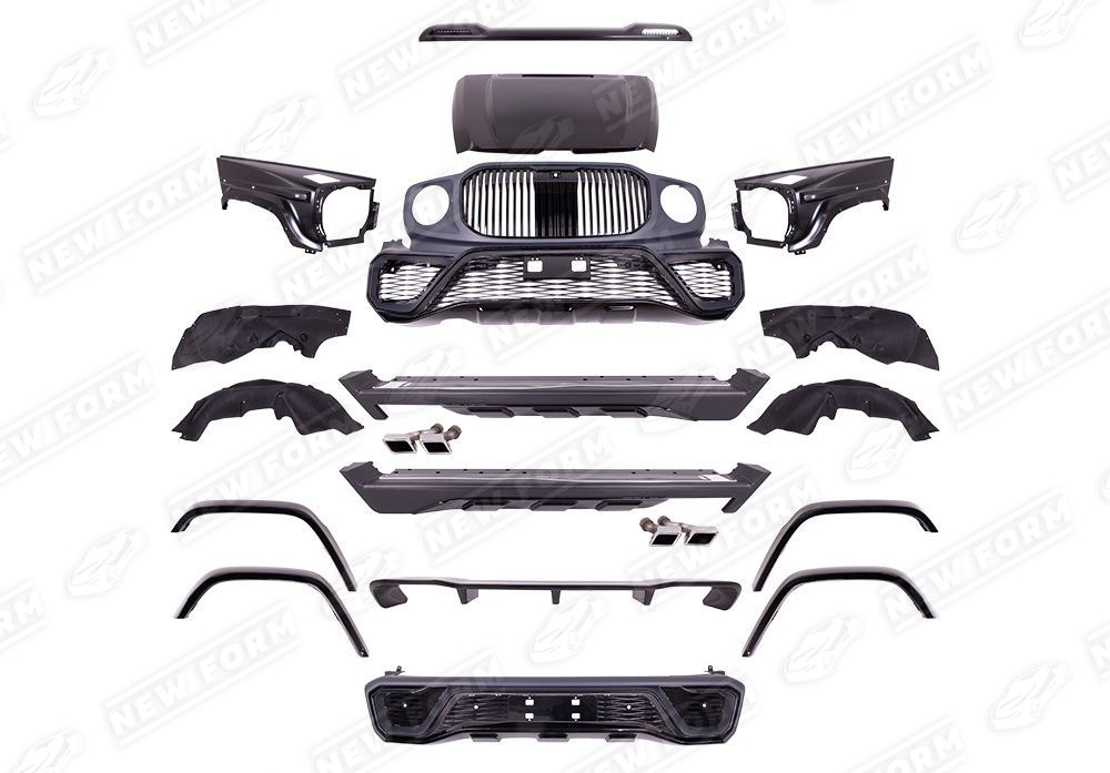 В комплект входит: передний бампер, решетка радиатора, крылья, капот, расширители арок, подкрылки, козырек с ходовыми огнями, пороги, насадки на глушитель, задний бампер, спойлер на крышу, комплект крепежа.