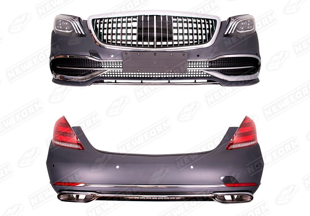 Комплект рестайлинга для автомобилей Mercedes Maybach S-class X222. Данный тюнинг комплект позволяет полностью переделать внешний облик автомобиля Maybach Mercedes S-class X222 с 2014 по 2017 год выпуска в версию X222 рестайлинг. Комплектующие рестайлинга изготовлены из оригинального ABS пластика. Насадки на глушитель - нержавеющая сталь. Оптика оригинального качества. Комплект рестайлинга устанавливается четко в штатные места без доработок. Весь необходимый для корректной установки рестайлинга на автомобиль крепеж входит в комплект. Рестайлинг комплект Maybach поставляется под окрас.
