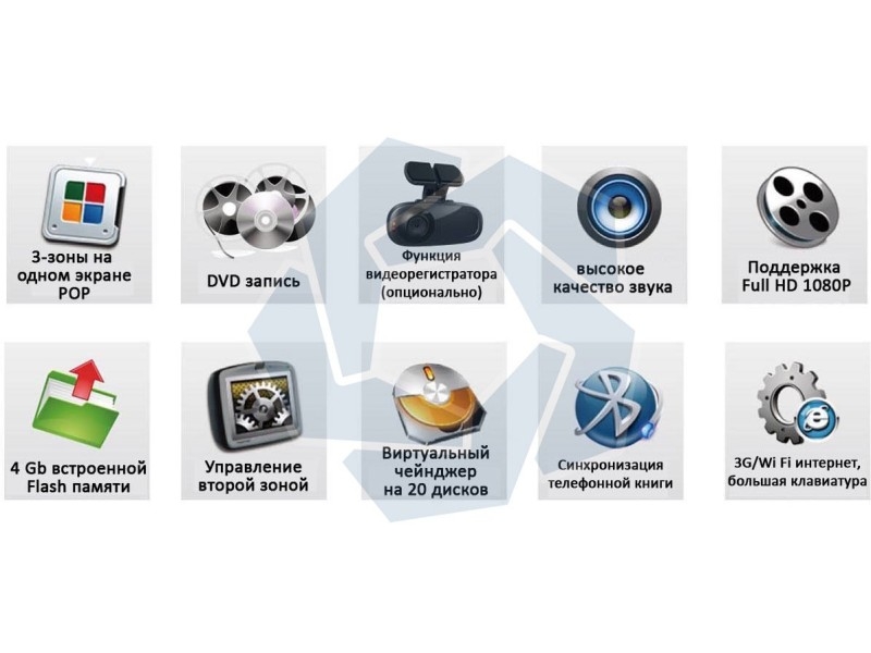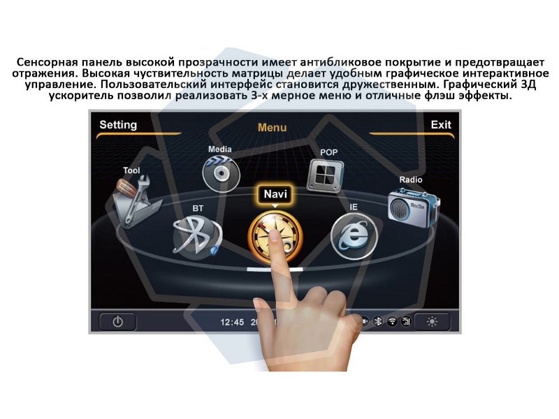 Технические характеристики: Параметры дисплея: 7'' сенсорный, 16:9 TFT LCD, высокого разрешения, 800 х 480 точек Процессор и память: Dual Core Cortex A8 1Ghz Samsung S5PV210, RAM DDR2 512 MB, HDD 4Gb Операционная система: Windows CE 6.0 Встроенный GPS приемник: Есть, Навигационное ПО в комплекте на SD/MMC карте памяти Отображение пробок: Есть (при покупки USB модема) Выход в Интернет: Есть (при покупки USB модема) Поддерживаемые форматы: CD-audio, DVD-video, MP3, MPEG4, WMA, JPEG, GIF, PNG Типы носителей: CD, CD-R, CD-RW, VCD, DVD, DVD-R, DVD-RW, iPod, USB, SD, MMC Усилитель: 4 х 45 Вт 4-8 Ом Русифицированный интерфейс: Есть Встроенный FM/AM тюнер: Есть Встроенный аналоговый ТВ-тюнер: Есть Встроенный CD чейнджер: Есть Режим "картинка в картинке": Есть Поддержка управления на руле: Есть Встроенная громкая связь Bluetooth: Есть Подключение датчиков парковки: Есть Подключение камеры парковки: Есть Установка индивидуального логотипа: Есть Комплектация: Головное устройство Провода для штатного подключения Кабель USB Кабель iPOD Антенна GPS Пульт ДУ Инструкция