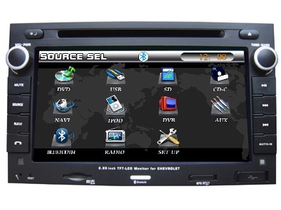 Головное устройство с проигрывателем DVD/MP4/DIVX/CD/MP3 для Chevrolet Epica, Aveo, Captiva. Точно совпадает по размерам с штатным головным устройством, фактурой и цветом с торпедой. USB порт и слот для SD карт, Bluetooth.