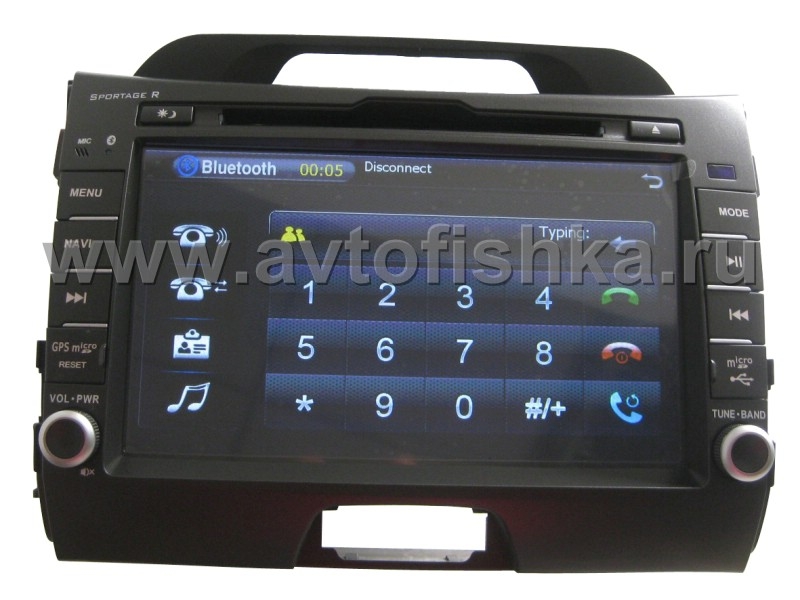 Головное устройство с проигрывателем DVD/MP4/DIVX/CD/MP3 для Kia Sportage после 2010 года. Точно совпадает по размерам со штатным головным устройством, фактурой и цветом с торпедой. USB порт и слот для SD карт, Bluetooth.