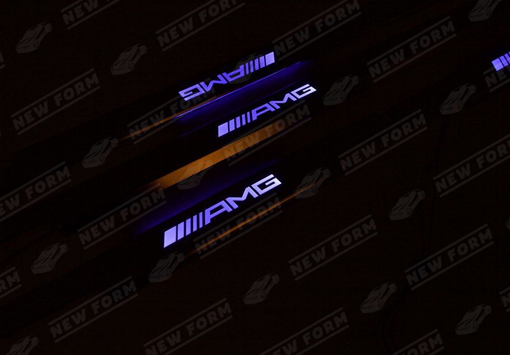 Накладки на пороги с подсветкой AMG для автомобилей Mercedes G-class W463. Данный комплект накладок на пороги предназначен для установки на автомобили Мерседес Гелендваген с 1990 по 2018 год выпуска. Накладки устанавливаются на внутренние пороги четко в штатные места без доработок. Накладки на пороги выполнены в цвете хром. Необходимая для корректного подключения накладок на пороги AMG проводка входит в комплект.