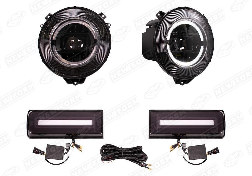 Оптика рестайлинг 2018 для автомобилей Mercedes G-class W463. Данный комплект передних фар и задних фонарей предназначен для установки на автомобили Мерседес Гелендваген с 1990 по 2018 год выпуска. Передние фары и задние фонари устанавливаются четко в штатные места автомобилей без доработок. Фары и фонари - точная копия оригинала. Передние фары выполнены в черном цвете. Задние фонари черные. Необходимые для корректной установки рестайлинговой оптики крепеж, проводка и блоки розжига входят в комплект.