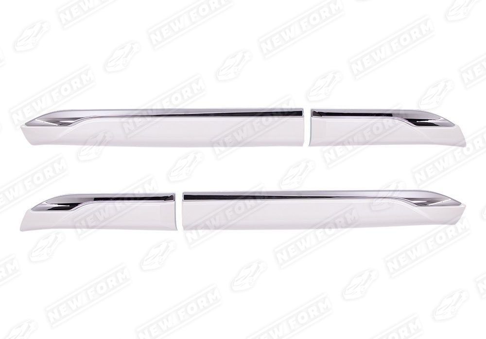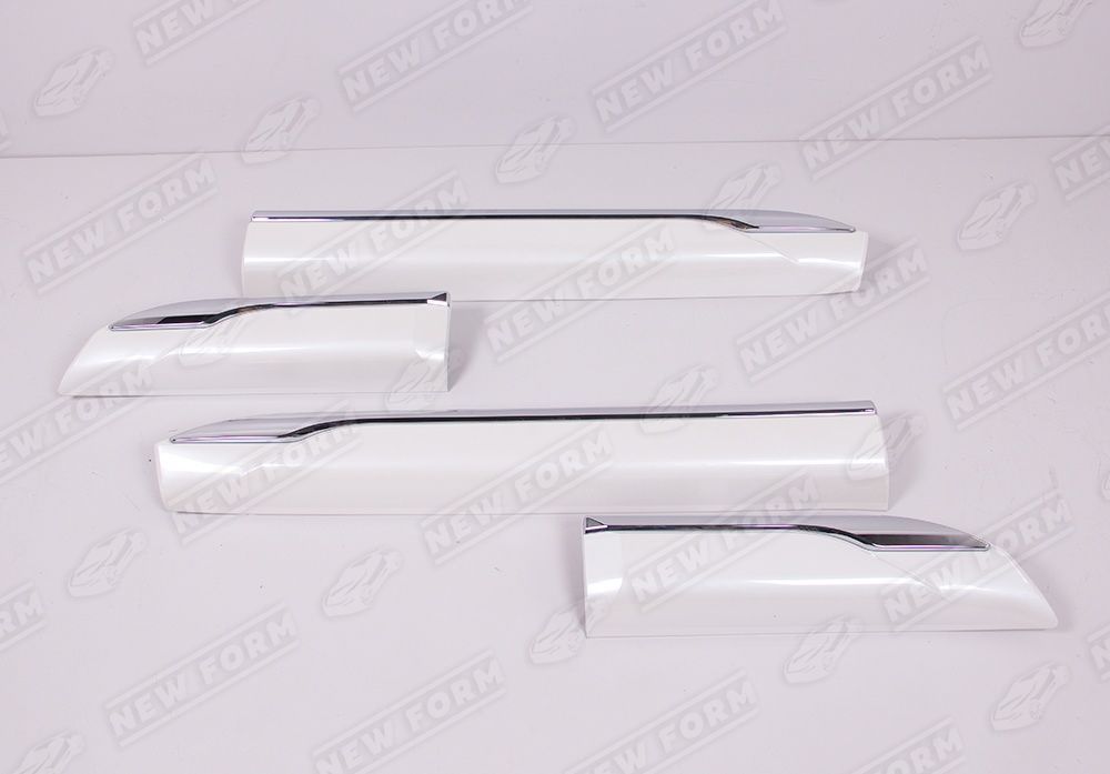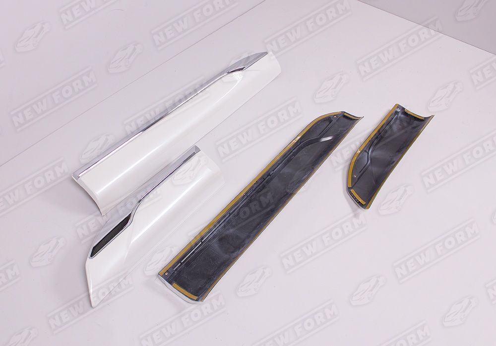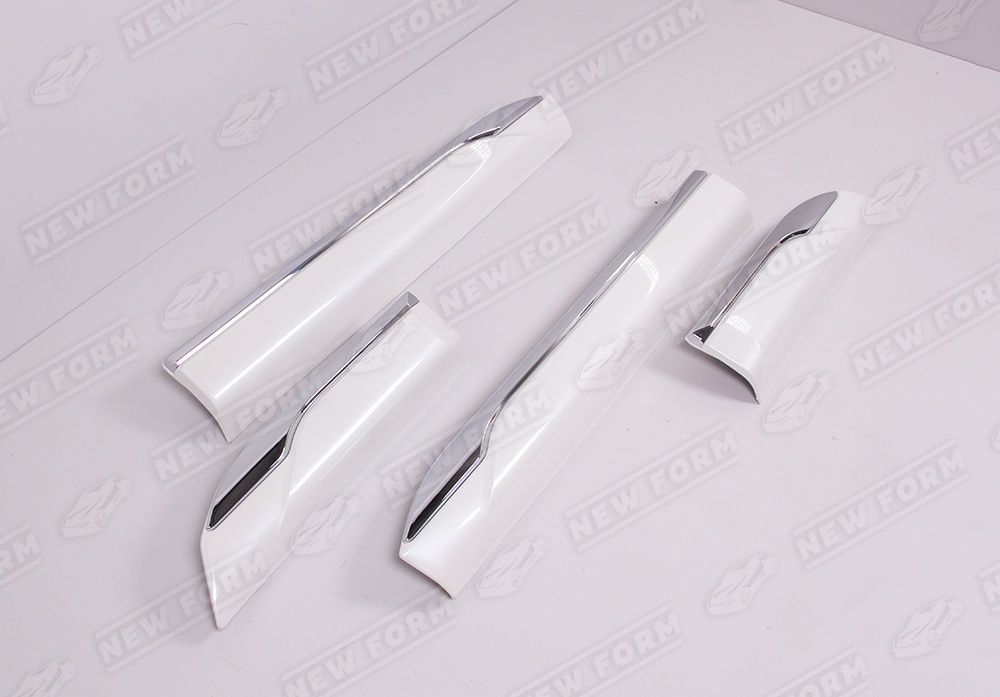 Молдинги широкие для автомобилей Toyota Land Cruiser 300. Данный комплект молдингов предназначен для установки на автомобили Toyota Land Cruiser 300 с 2021 года выпуска. Молдинги устанавливаются четко в штатные места автомобиля без доработок. Молдинги выполнены в белом цвете с хромированными элементами.