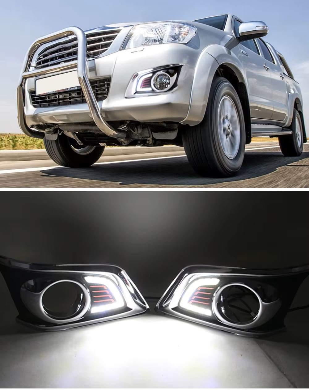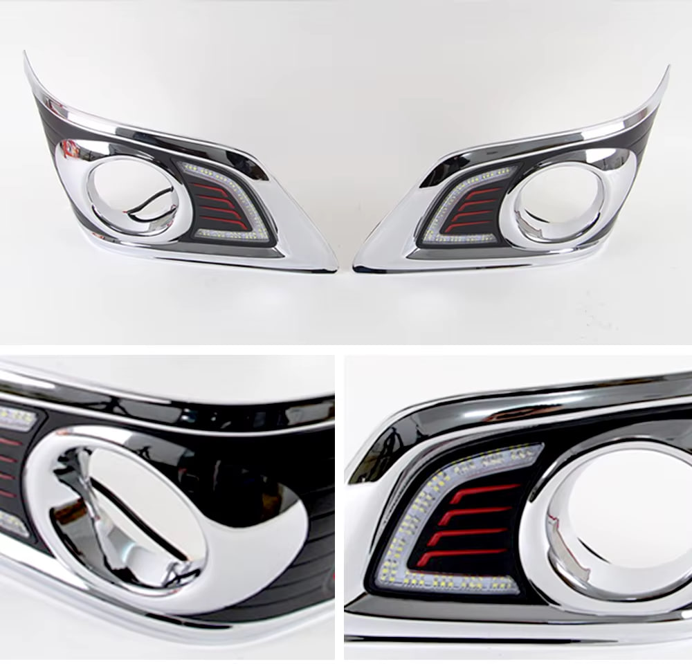 Придайте вашему Toyota Hilux Vigo более современный и выразительный облик с этим комплектом хромированных накладок на передний бампер со встроенными дневными ходовыми огнями. Данные вставки не только обновляют дизайн передней части автомобиля, добавляя ему премиальный блеск, но и существенно повышают безопасность: яркие светодиоды делают пикап заметным на дороге в любое время суток. Это простое и эффективное тюнинг-решение, которое устанавливается без сложных доработок штатного бампера.