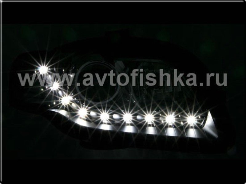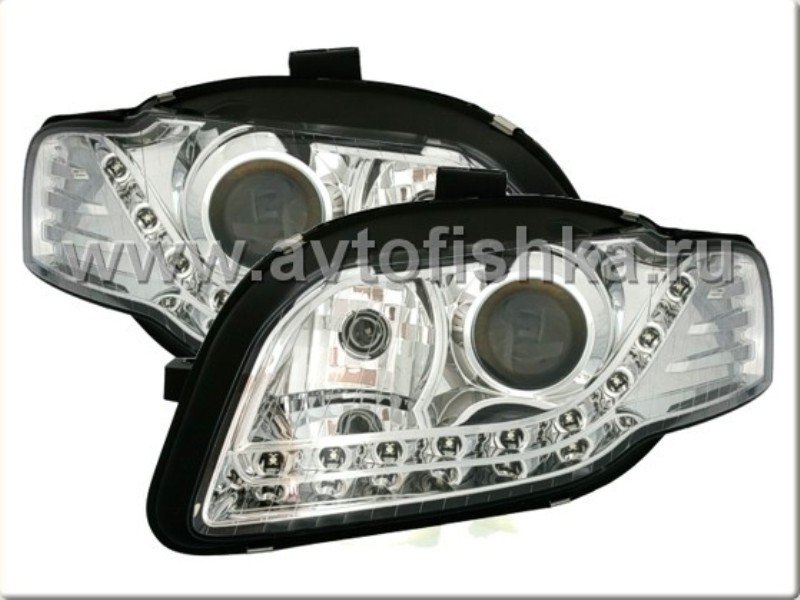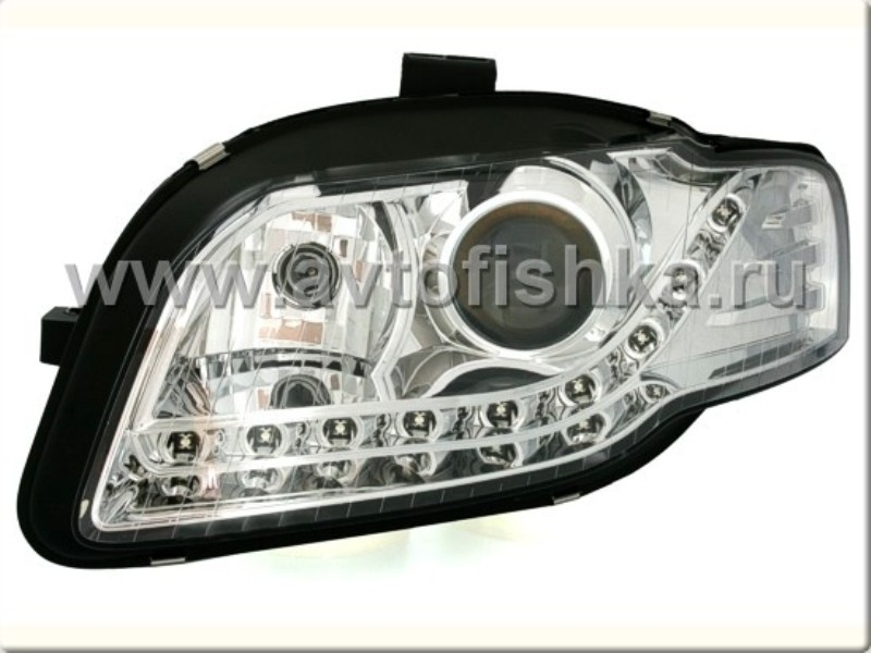 —Audi A4 (05-07) передние фары линзовые хромированные, со светодиодной подсветкой, с электрокорректором, комплект 2 шт.
