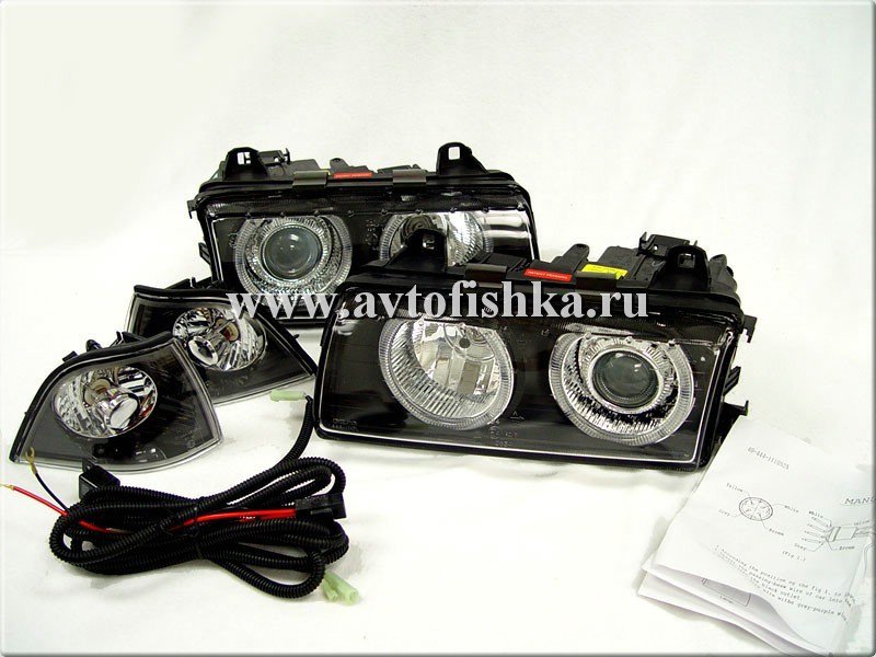 —BMW 3 E36 (91-00) 4 дв. седан фары передние черные, со светящимися ободками с поворотниками, комплект лев.+ прав.