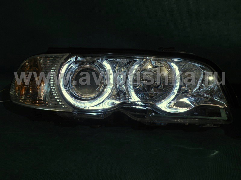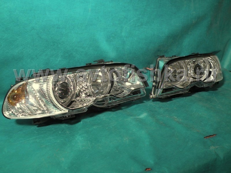 —BMW 3 E46 (98-01) 2 дв. фары передние линзовые хромированные, со светящимися ободками, с поворотниками, комплект лев.+прав.