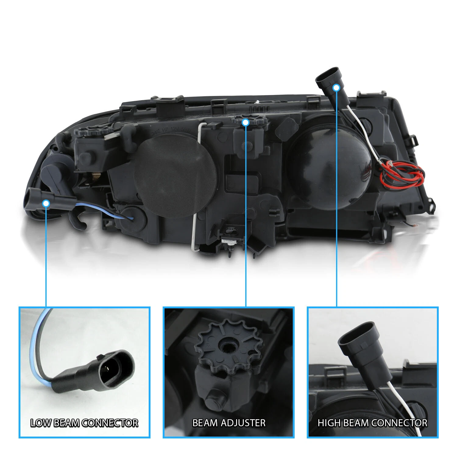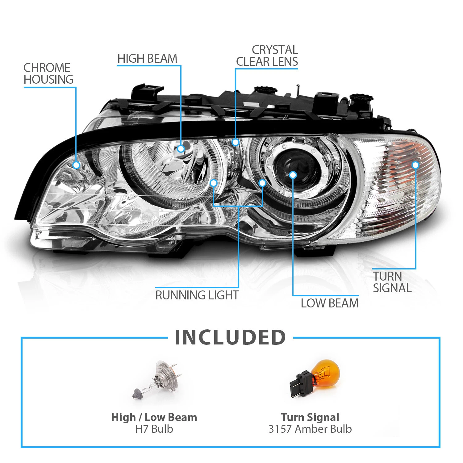 - Полная готовность к установке: В комплект уже входят галогеновые лампы H7 для ближнего и дальнего света, а также amber лампы 3157 для указателей поворота. Вам не потребуется ничего докупать.