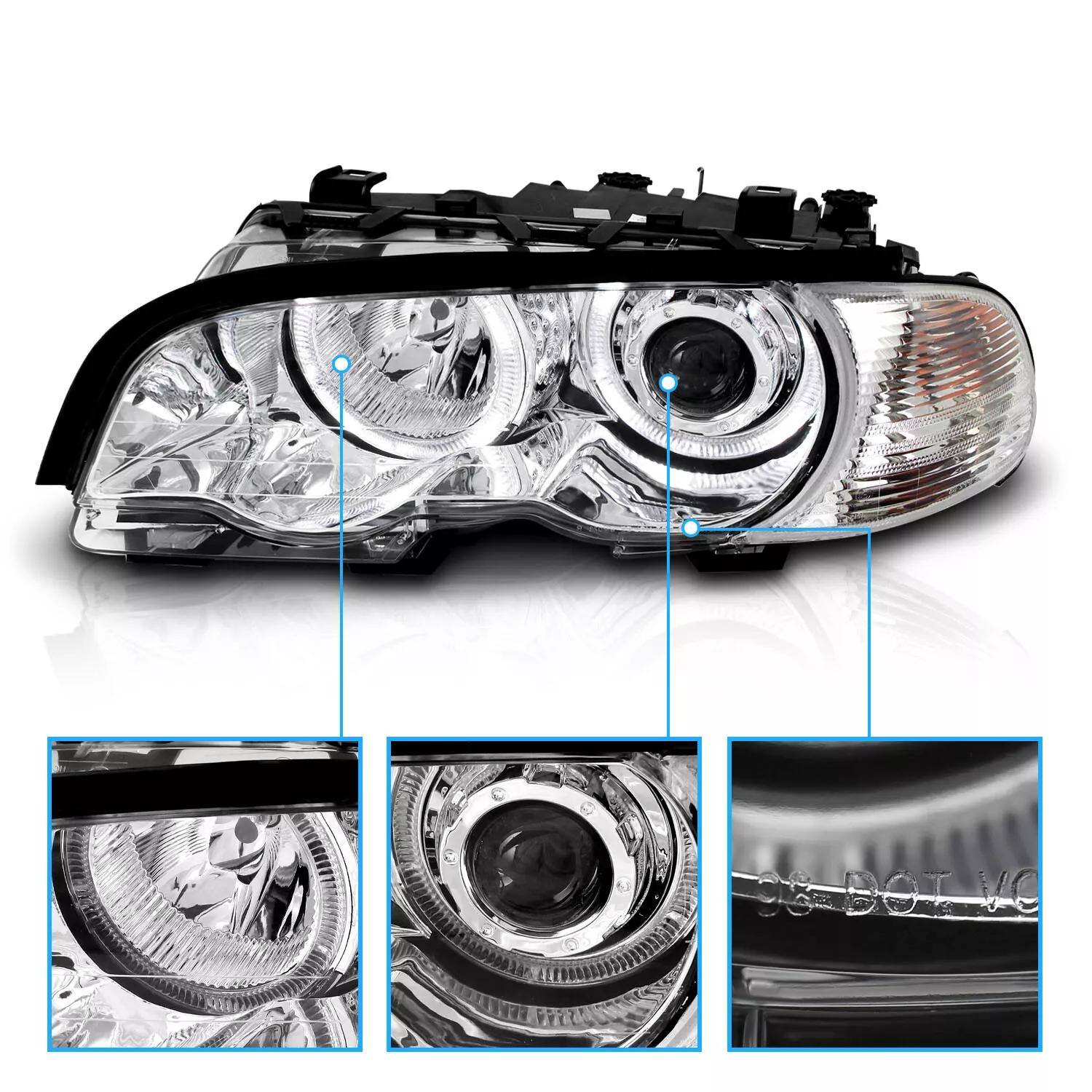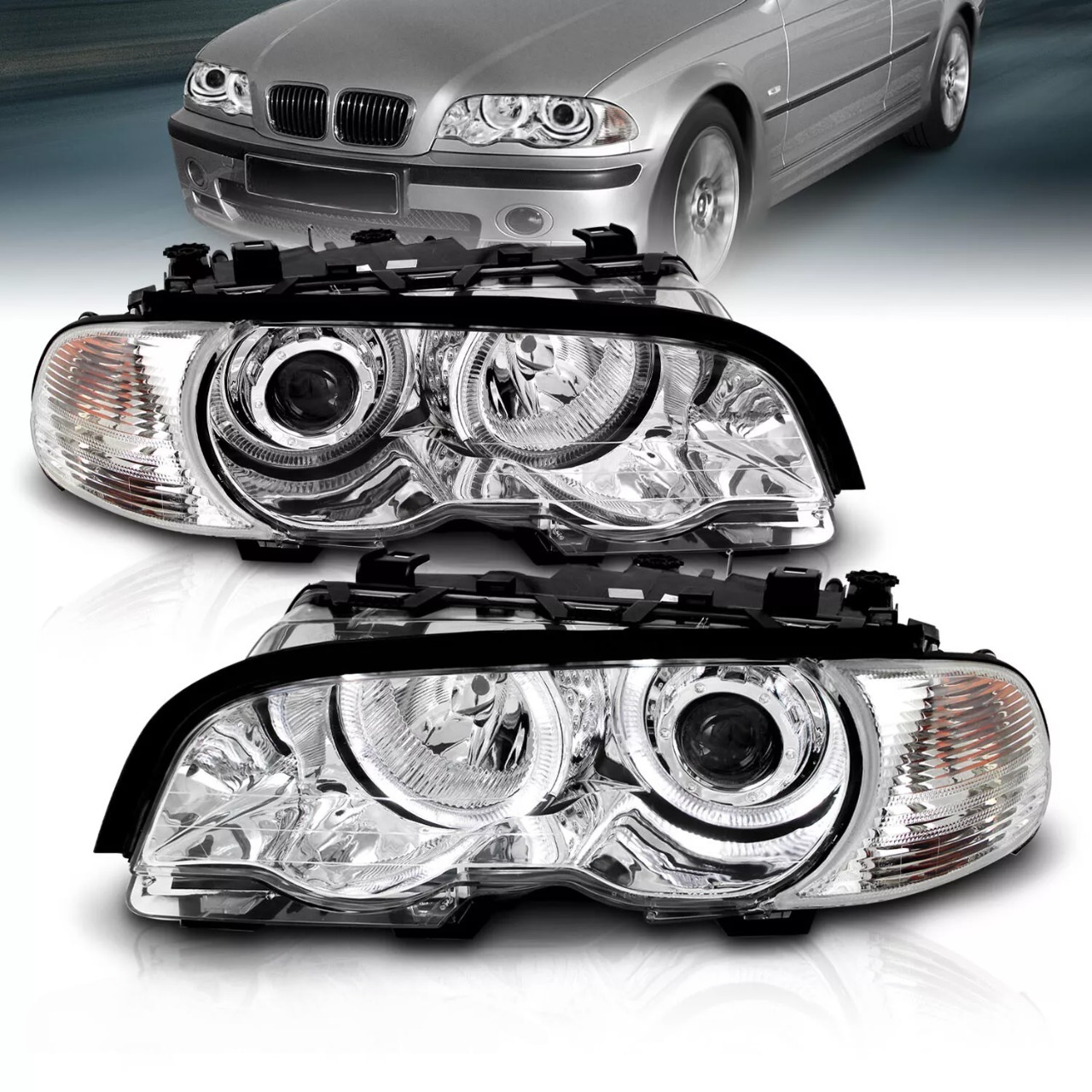 Придайте вашему BMW E46 купе или M3 элегантный современный стиль — комплект хромированных линзованных фар с двойными светодиодными ободками подарит автомобилю уникальный образ и превосходное качество освещения!