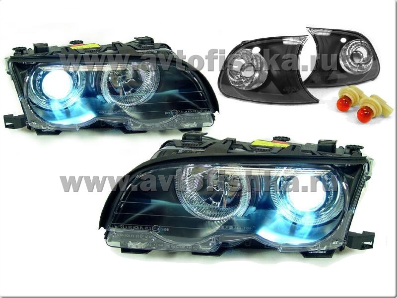 BMW 3 E46 (98-01) купе передние линзовые черные фары, со светящимися ободками, с поворотниками, с мотором электрокорректора, комплект лев.+прав.