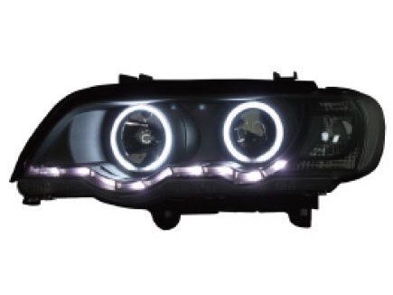 BMW X5 (1998-2003) фары передние линзовые черные, со светящимися ободками с подсветкой DRL