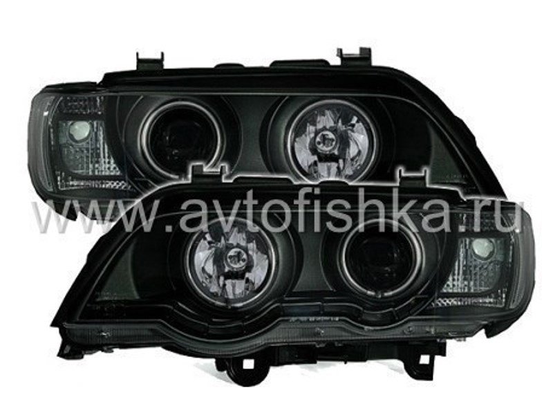 BMW X5 (98-03) фары передние линзовые черные, со светящимися ободками с подсветкой DRL, под ксенон