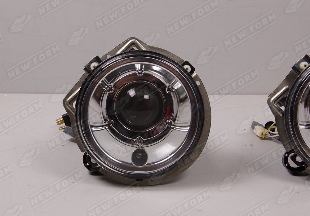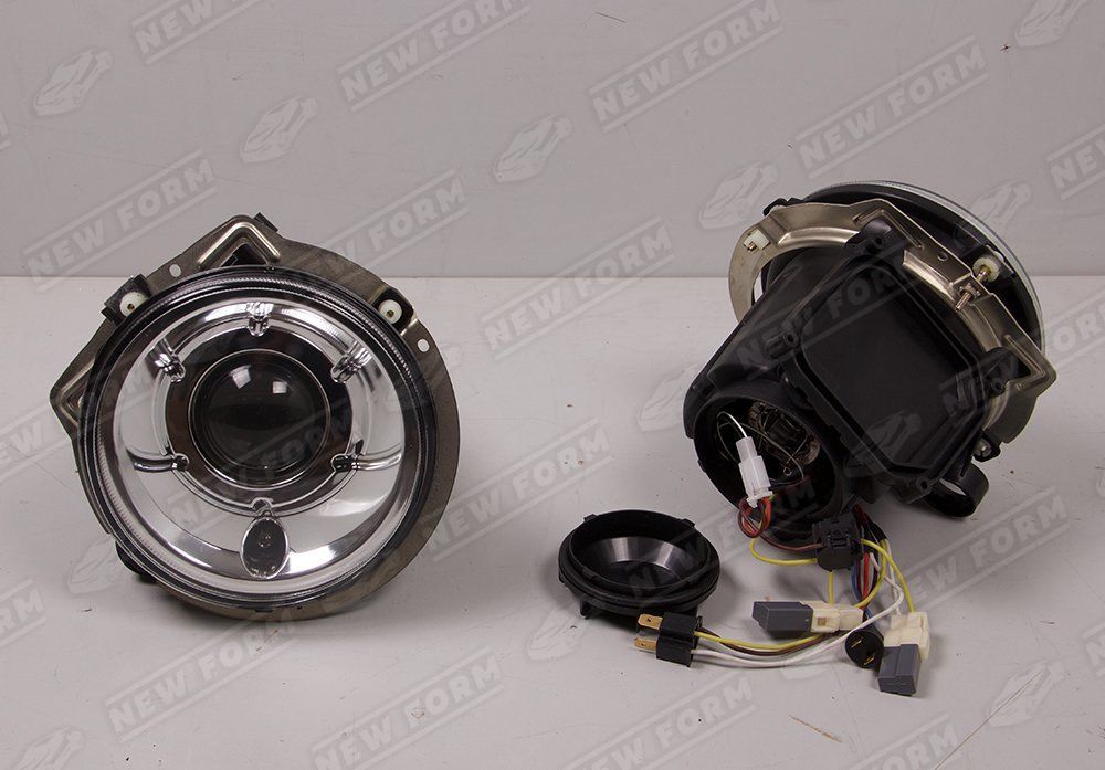 Фары передние хром для автомобилей Мерседес Гелендваген. Данный комплект фар предназначен для установки на автомобили Mercedes G-class W463 с 1990 по 2007 год выпуска. Фары устанавливаются четко в штатные места автомобиля без доработок. Весь необходимый крепеж, лампочки и проводка для подключения передних фар на автомобиль входят в комплект. Фары выполнены в цвете хром.