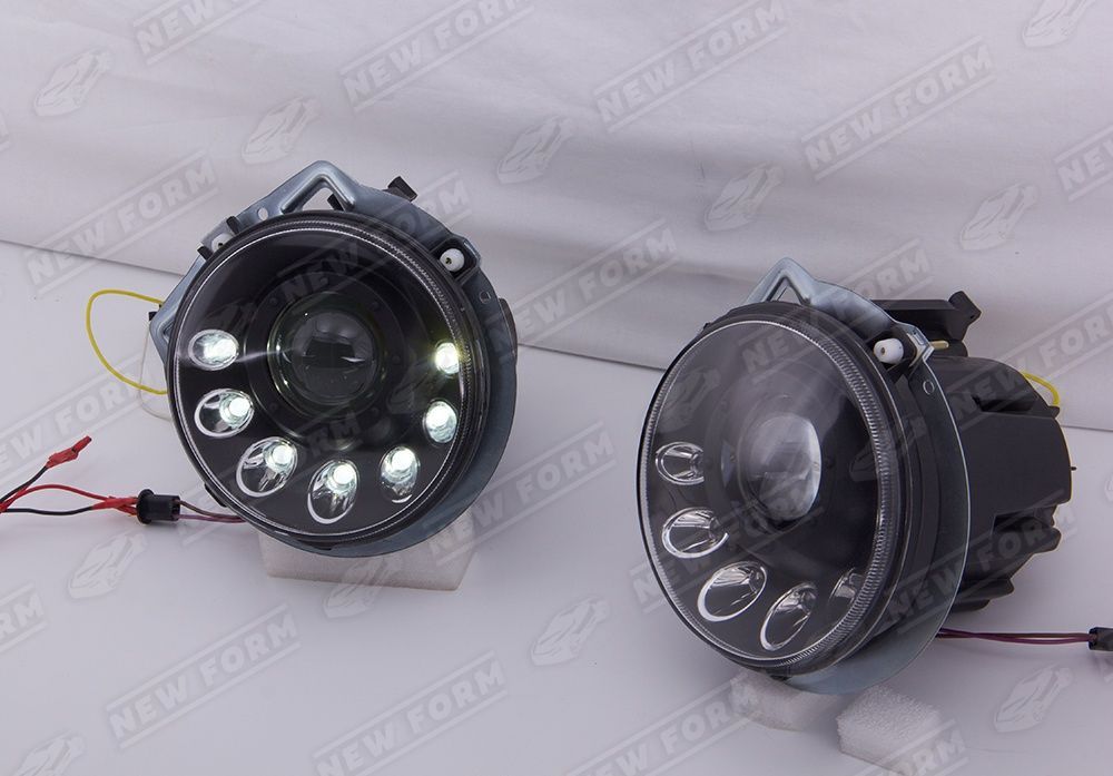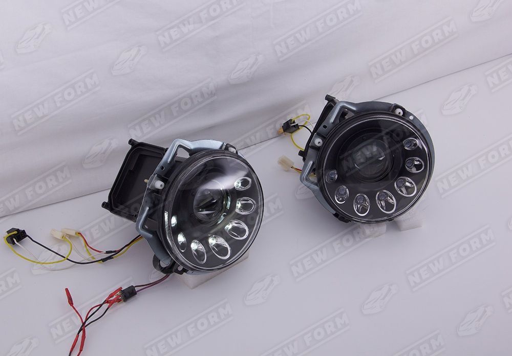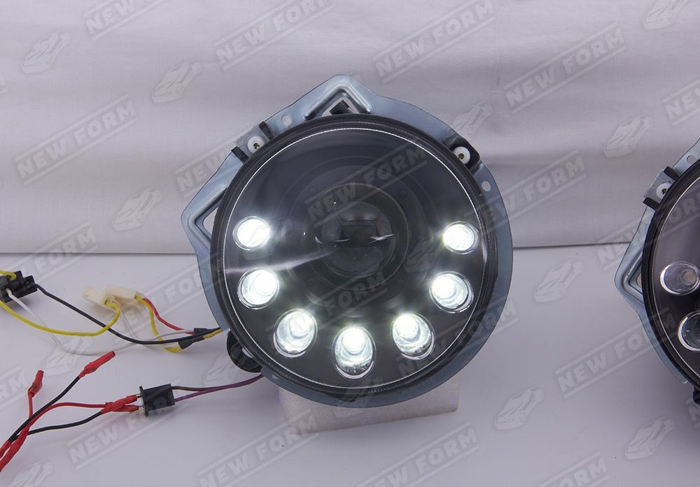 Фары передние Mansory 7 диодов для автомобилей Мерседес Гелендваген. Данный комплект фар предназначен для установки на автомобили Mercedes G-class W463 с 1990 по 2007 год выпуска. Светодиоды работают в двух режимах: при включении свет белый, поворотник горит желтым светом. Фары устанавливаются четко в штатные места автомобиля без доработок. Весь необходимый крепеж, лампочки и проводка для подключения передних фар на автомобиль входят в комплект. Фары выполнены в черном цвете.