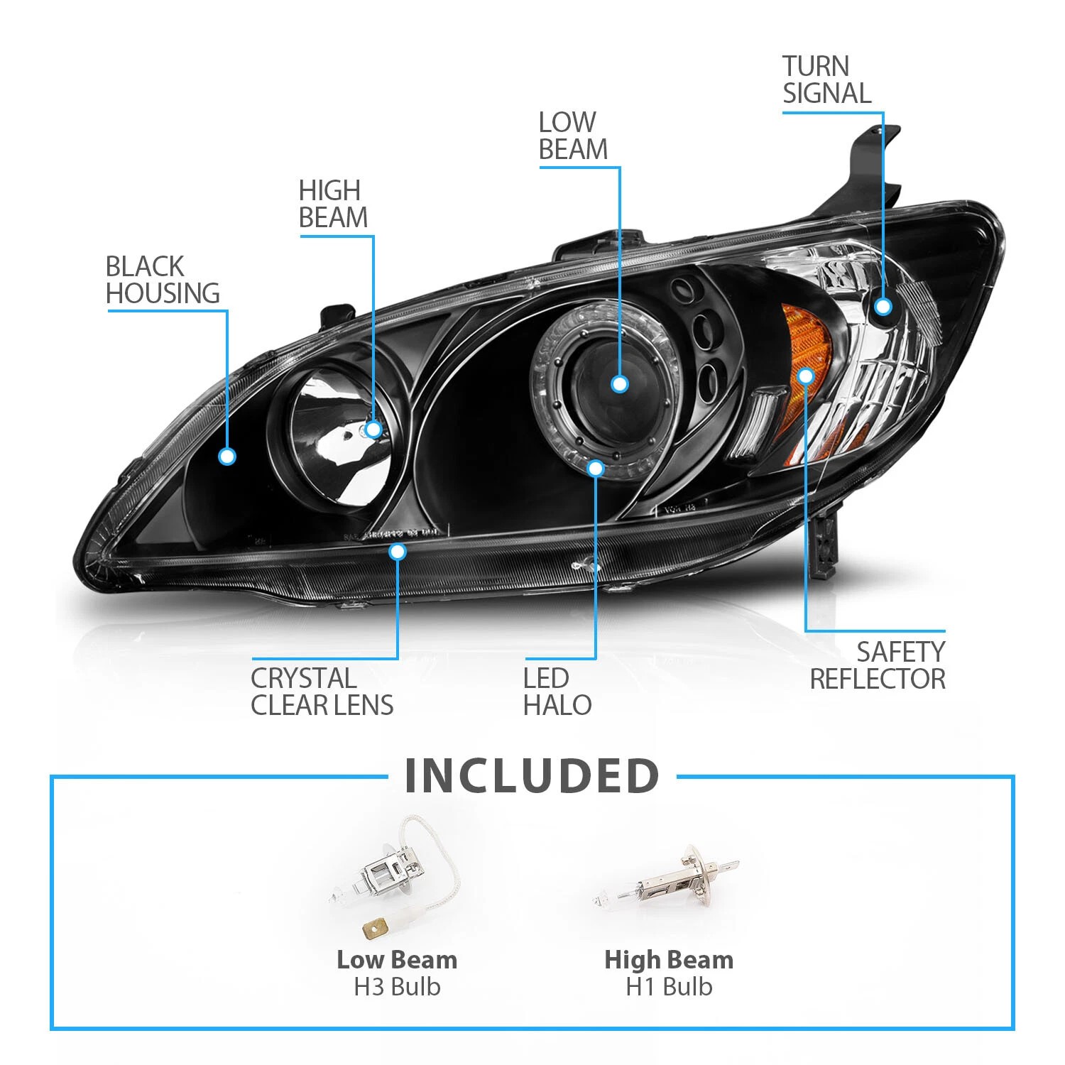 • Полная готовность к установке: В комплект уже входят галогеновые лампы H1 и H3 для ближнего и дальнего света. Вам не потребуется докупать основные лампы — просто перенесите лампы поворотников со старых фар.