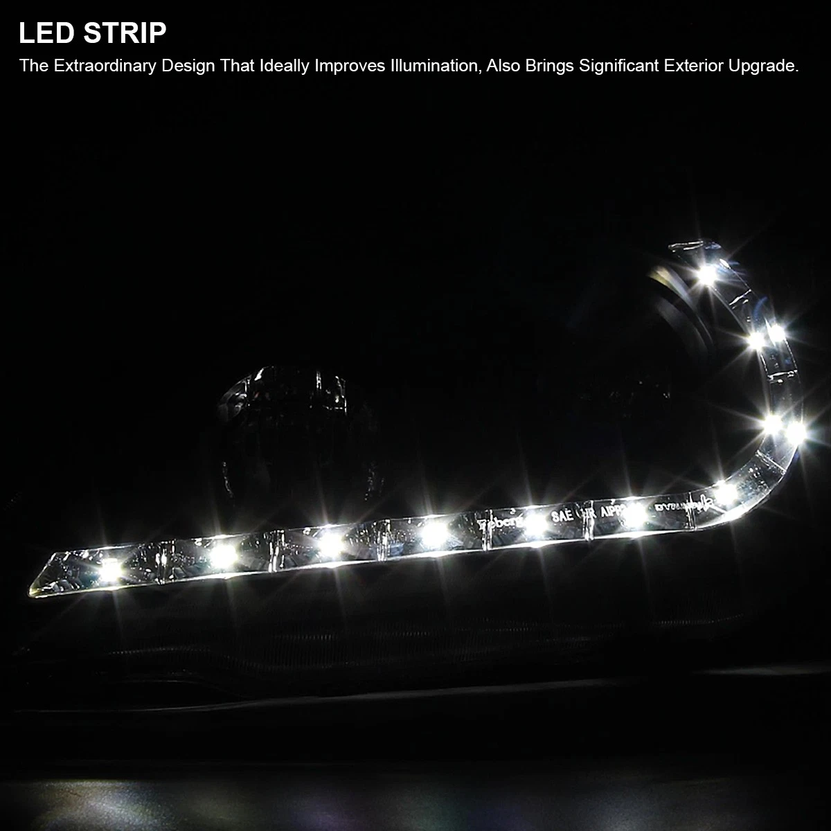 - Яркая светодиодная полоса: Интегрированная LED-полоса с чисто-белым свечением может использоваться как дневные ходовые огни или габаритный свет, повышая безопасность и привлекая внимание к автомобилю.