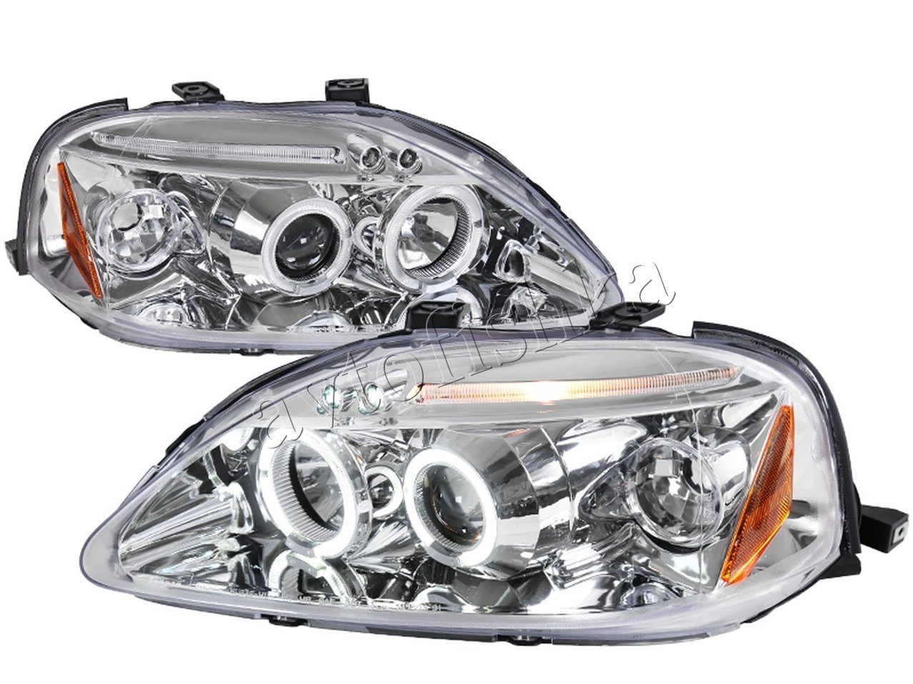 Honda Civic, Ferio EK (99-00) фары передние хромированные, со светящимися ободками с белыми рефлекторами, линзовые