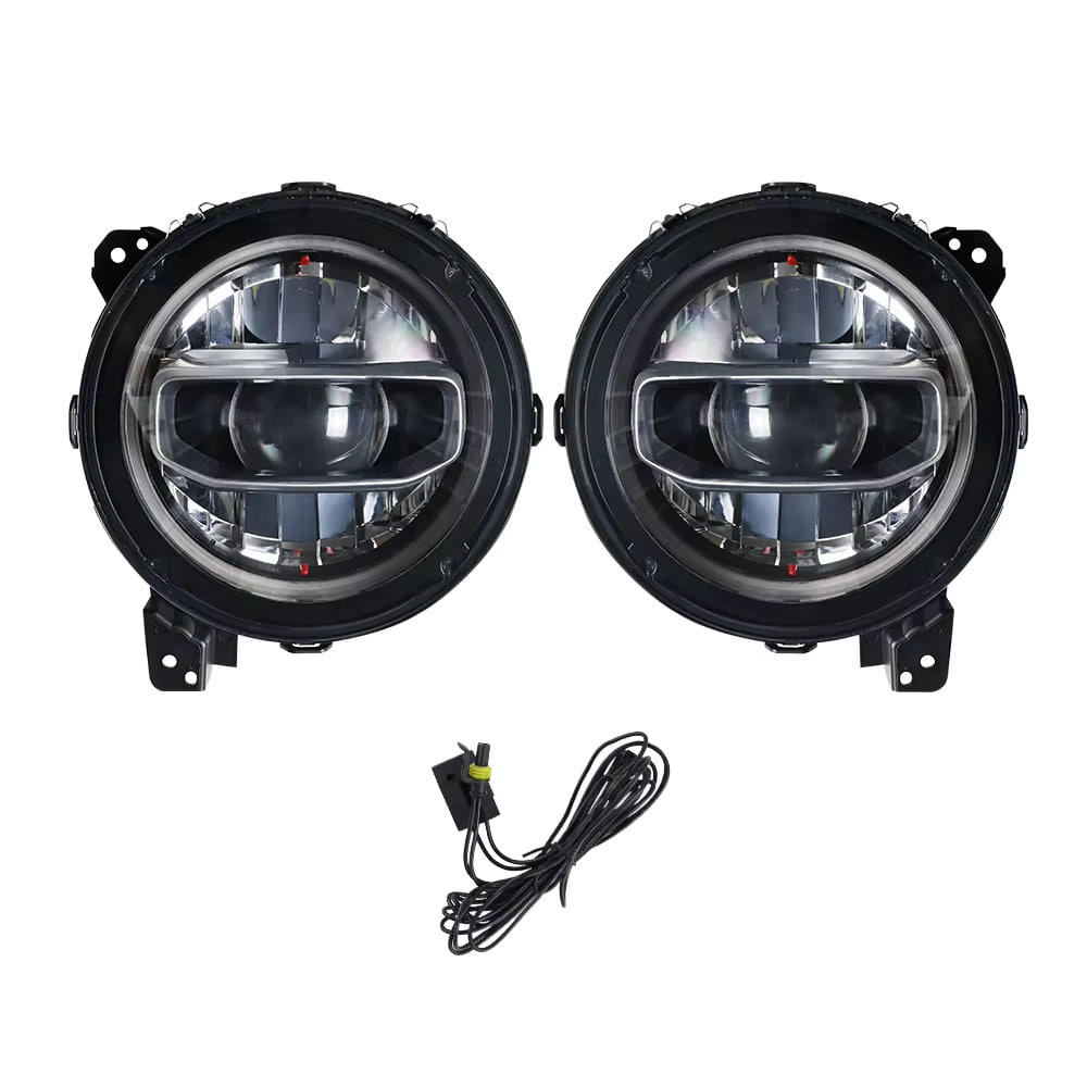 Современные 9-дюймовые светодиодные фары для Jeep Wrangler JL, JLU и JT Rubicon 2018-2023 годов. Мощная оптика с функцией Halo DRL и раздельным ближним/дальним светом. Полная соответствие международным стандартам безопасности.