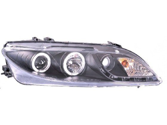 Mazda 6 (2002-2007) тюнинговые передние черные линзовые фары, со светящимися ободками и подсветкой DRL, комплект 2 шт.
