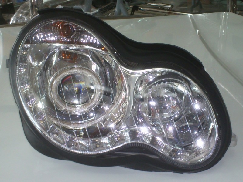 —Mercedes C-class W203 (03-07) передние фары линзовые хромированные со светящимися ободками и подсветкой DRL, в комплекте 2 шт.