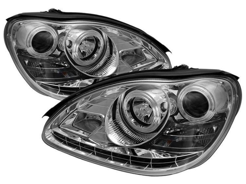 Mercedes S W220 (98-05) передние линзовые хромированные фары, с подсветкой DRL, комплект 2 шт.