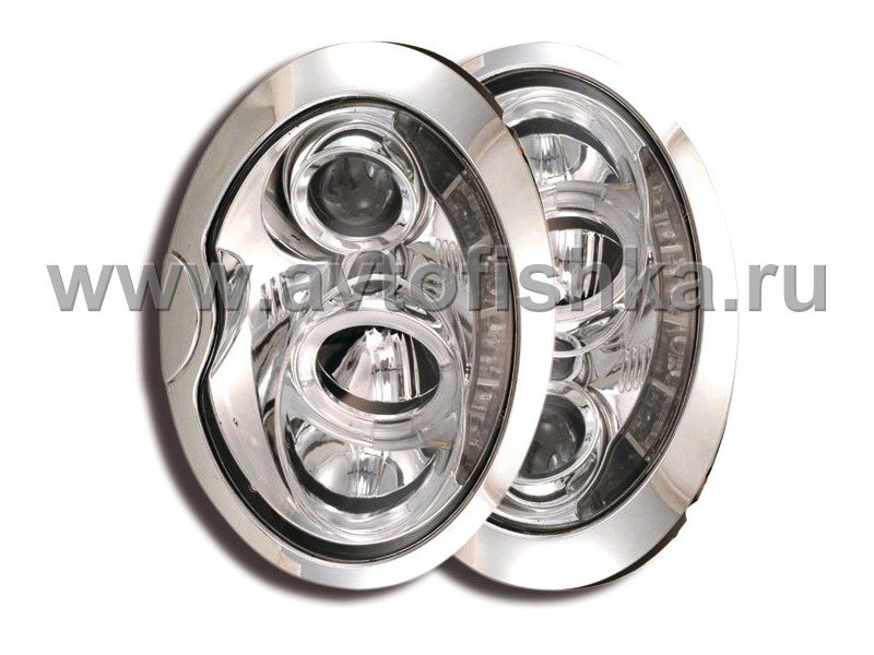 Mini Cooper фары передние линзовые хромированные, со светящимися ободками, с DRL подсветкой, комплект 2 шт.