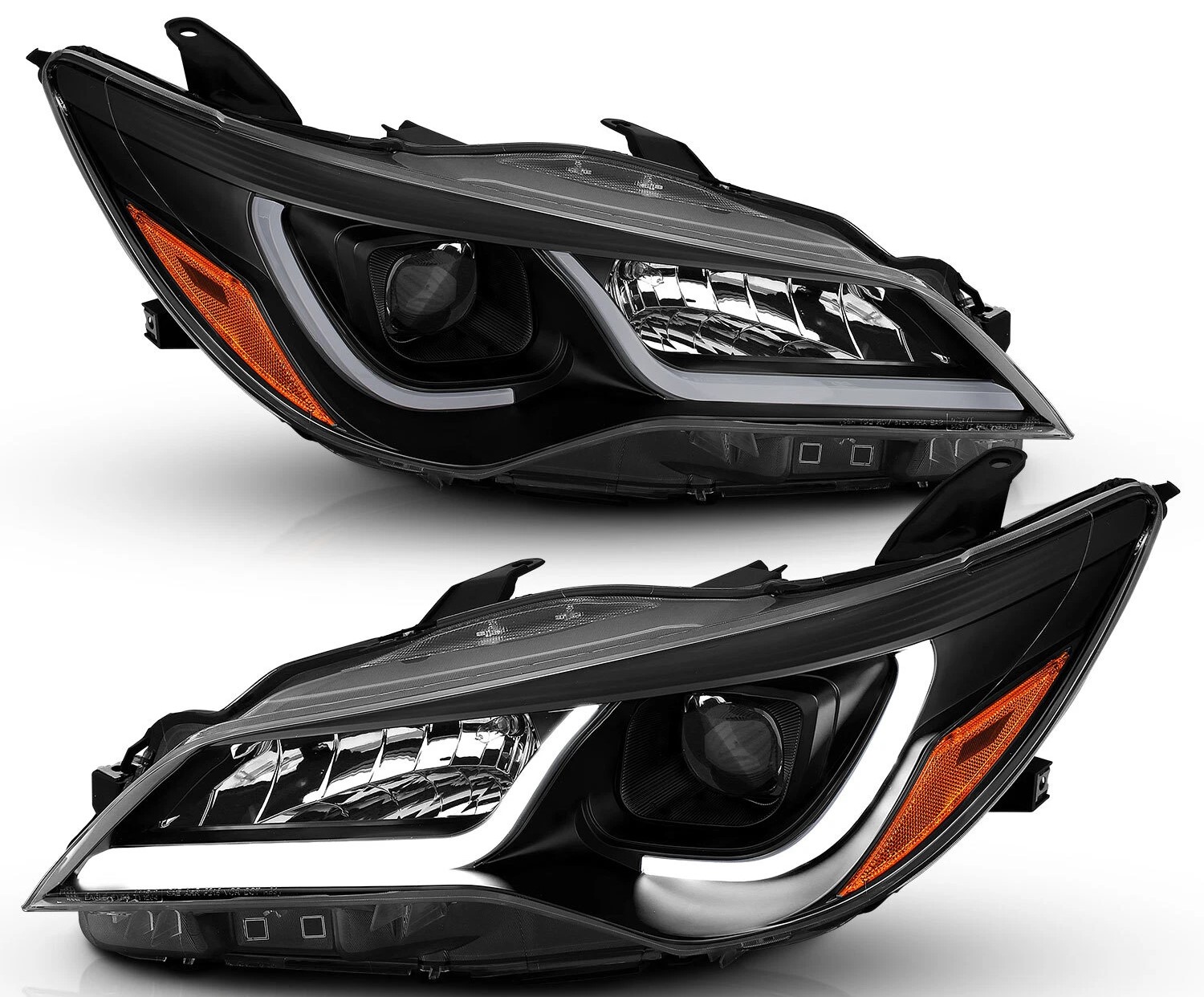 Современные передние фары с яркой светодиодной ДХО подсветкой для Toyota Camry XV55 рестайл 2015-2017 годов. Фары в черном корпусе с линзованной оптикой создают стильный и выразительный облик, придавая автомобилю индивидуальность. Это прямое обновление для штатных фар, которое легко устанавливается.