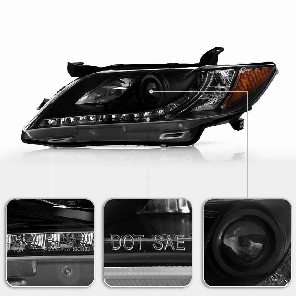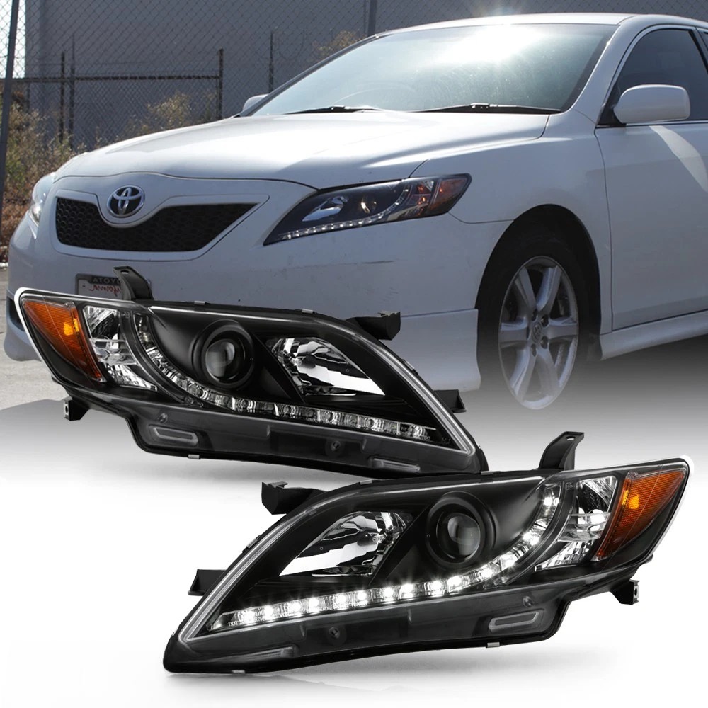 Современные передние фары с проекторной оптикой и светодиодными дневными ходовыми огнями для Toyota Camry 2007-2009 годов. Черный корпус и прозрачные линзы, оснащенные премиальными компонентами Osram для яркого света и надежной работы.