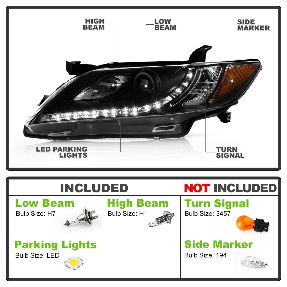 Передние фары для Toyota Camry (2007-2009) | Проекторная оптика с LED DRL | Черный корпус | Компоненты Osram