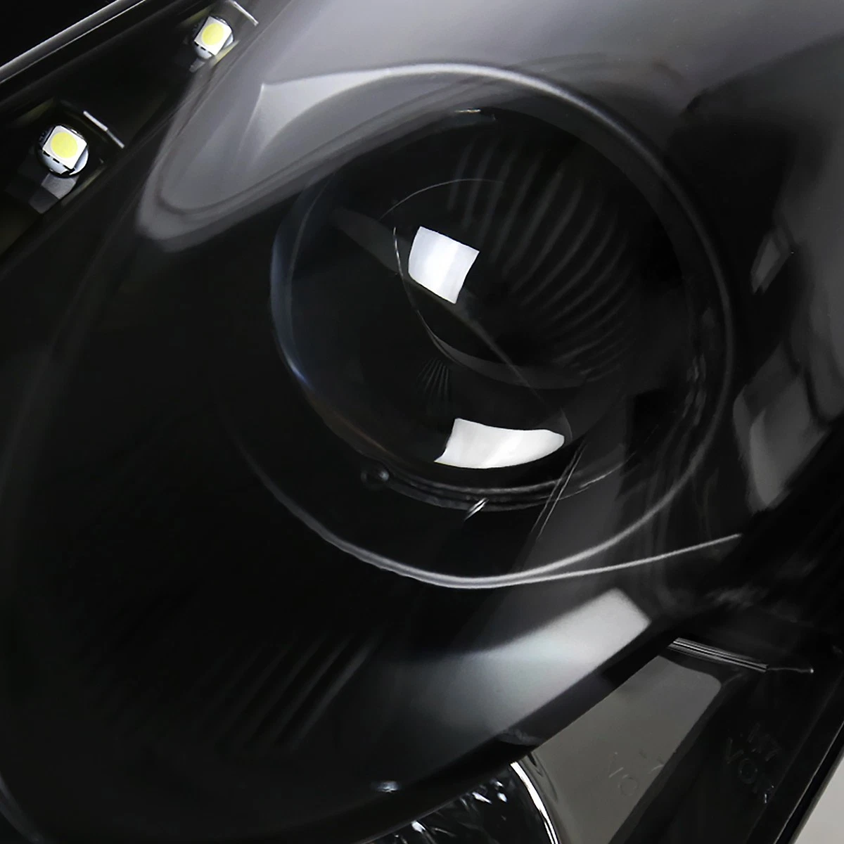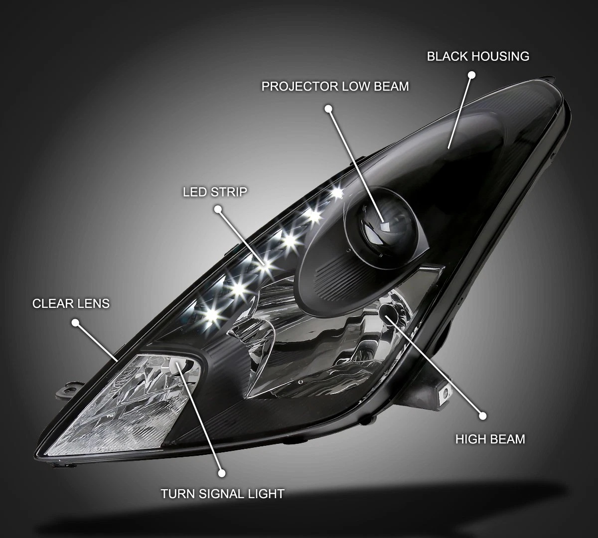Современные линзованные фары со светодиодными дневными ходовыми огнями (DRL) для Toyota Celica 2000-2005. Стильный черный корпус с прозрачными линзами и яркой светодиодной полосой создает запоминающийся облик. Фары обеспечивают точное светораспределение и повышенную безопасность благодаря встроенным DRL.