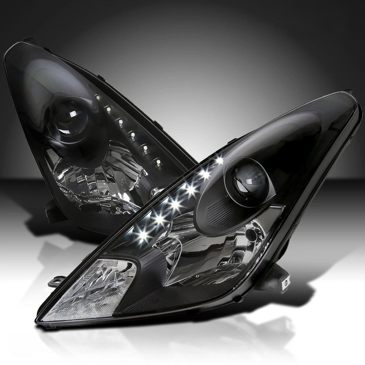 Передние фары линзовые для Toyota Celica (2000-2005) | Черные с DRL-огнями | Комплект 2 шт.