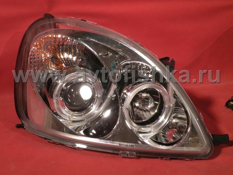 Toyota Yaris, Vitz (99-05) фары передние линзовые хромированные, со светящимися ободками, комплект 2 шт.