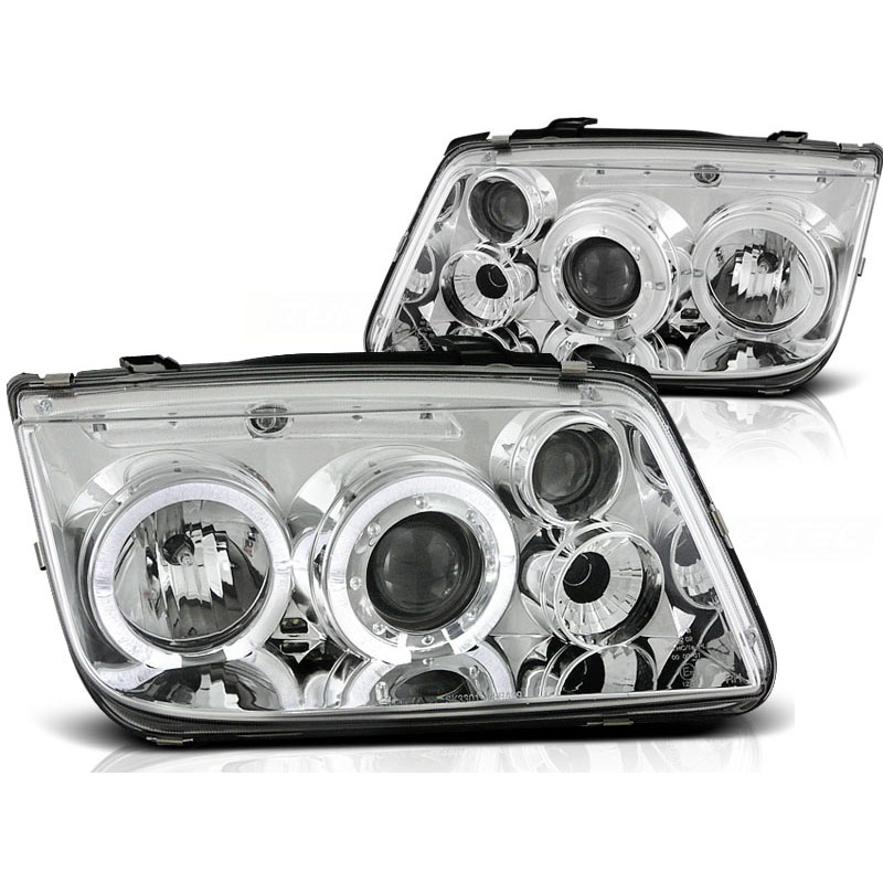 Фары передние линзованные для Volkswagen Bora (1998-2005) с ПТФ и Angel Eyes | Хромированные | Лампы в комплекте