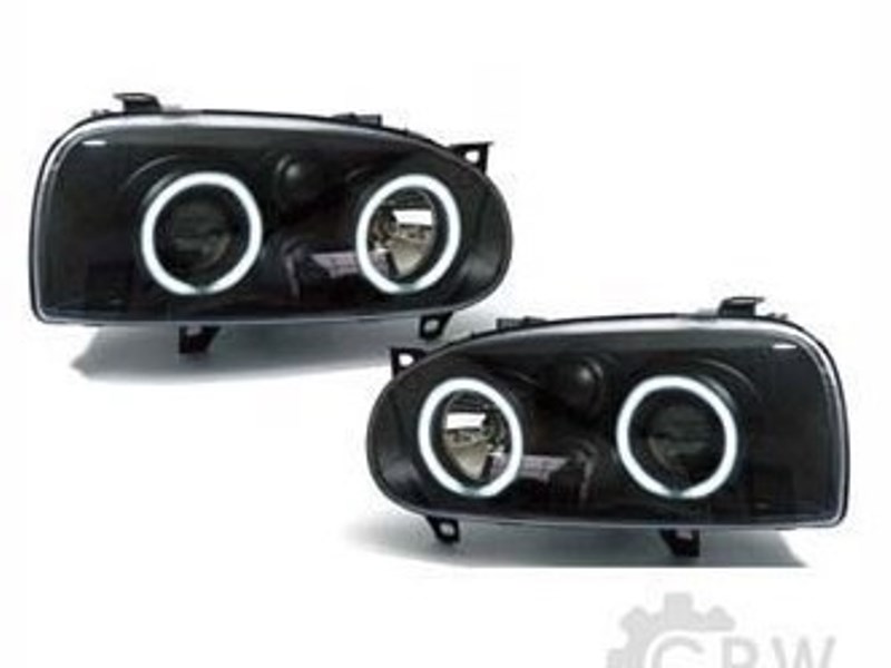Volkswagen Golf 3 (92-98) передние фары линзовые черные, со светящимися ободками, комплект 2 шт.