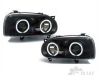 —Volkswagen Golf 3 (92-98) передние фары линзовые черные, со светящимися ободками, комплект 2 шт.