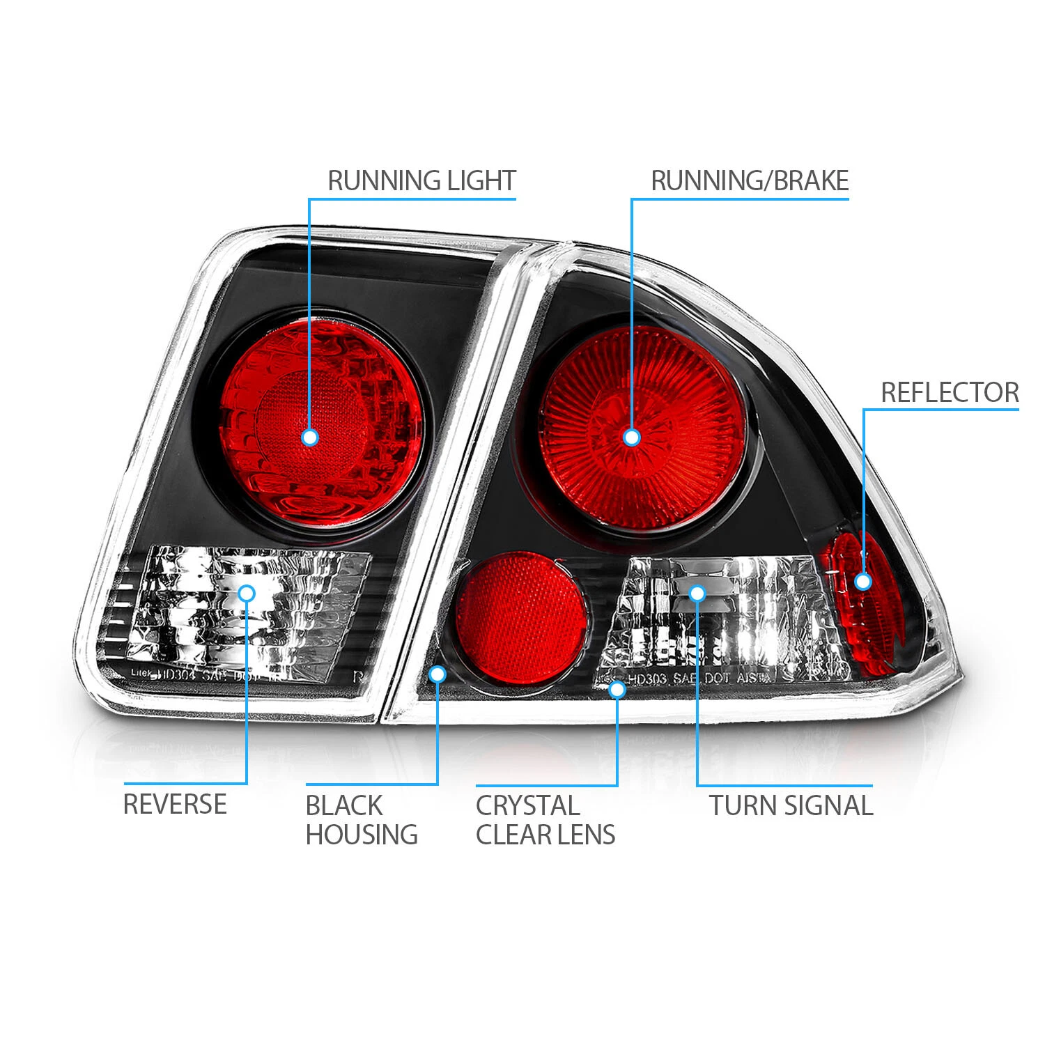 Стильные задние фонари с черным корпусом и прозрачными линзами для Honda Civic седан 2001-2005 годов. Этот комплект придаст задней части вашего автомобиля современный и спортивный облик, выделяя его на дороге. Подходит для всех основных комплектаций седана, обеспечивая точную замену штатных фонарей без сложного монтажа.