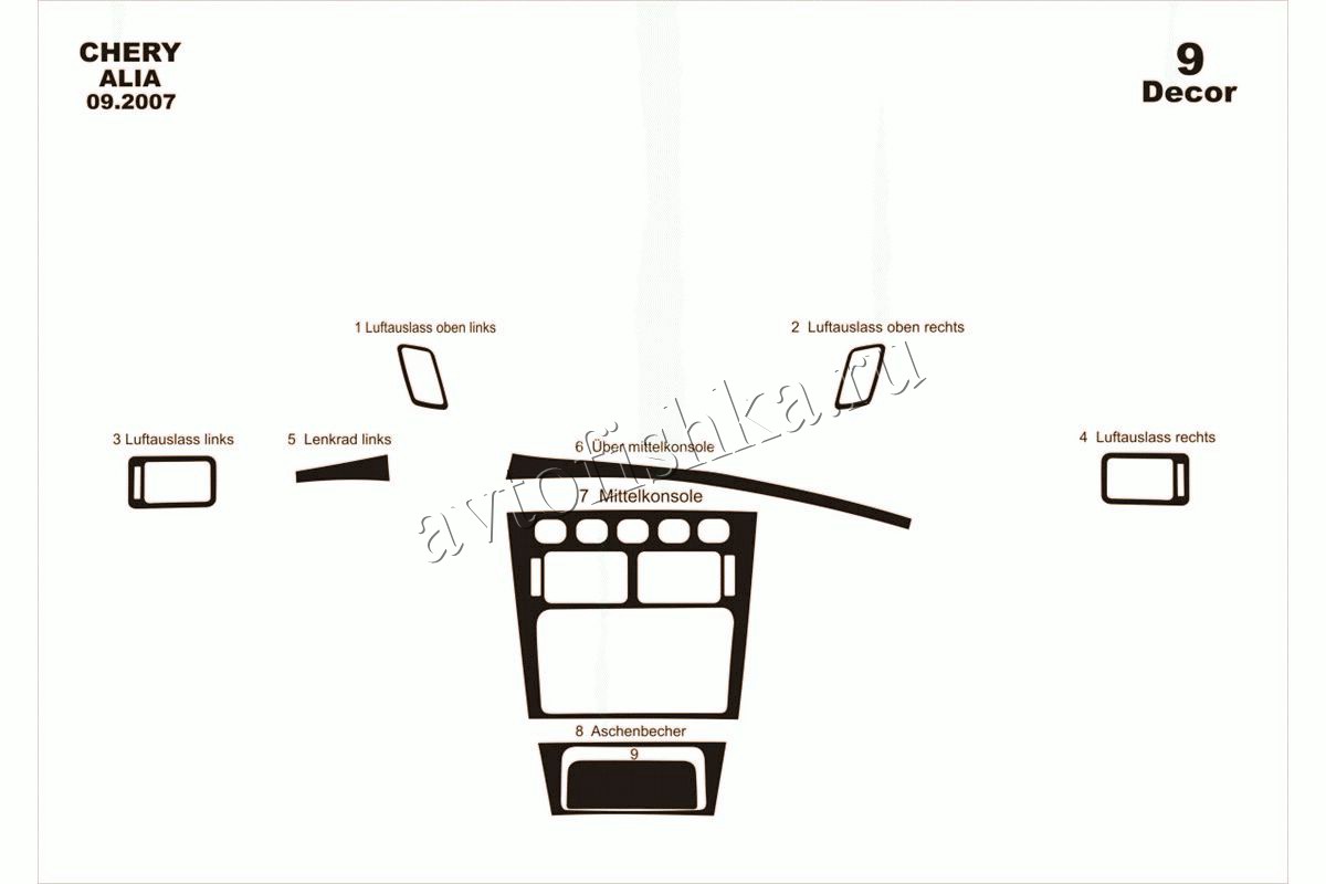 Декоративные накладки на панель приборов | Тюнинг салона для Chery Fora 2006-2010 полный набор накладок в салон