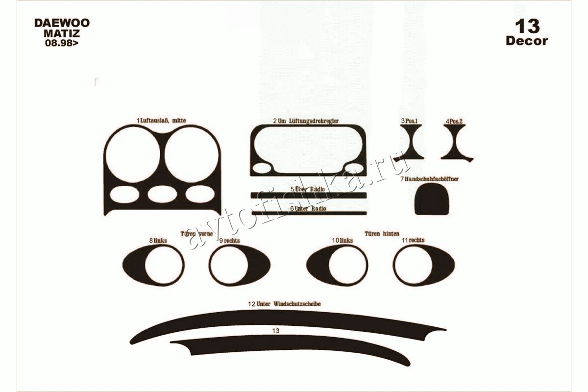 Декоративные накладки на панель приборов | Тюнинг салона для Daewoo Matiz 1998-2005 полный набор накладок в салон, 13 элементов